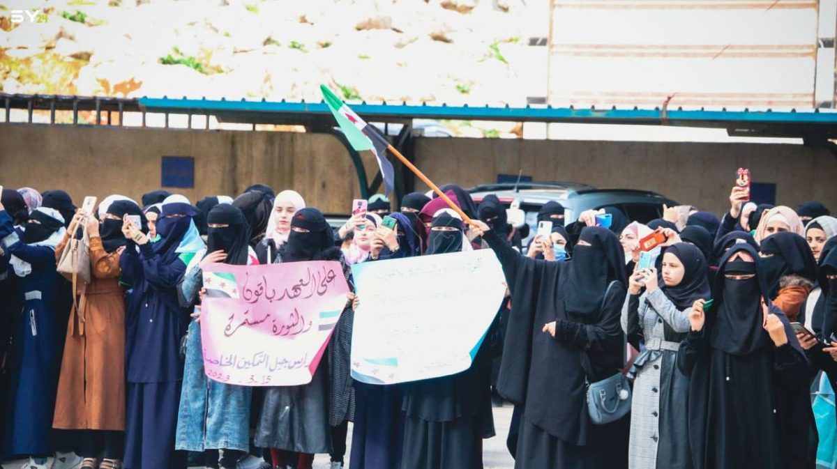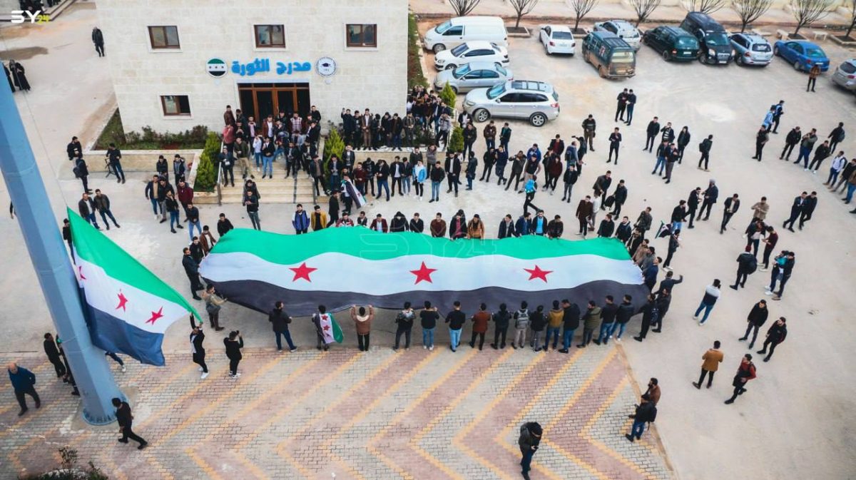 طلاب جامعة الشمال الخاصة في إدلب، يطالبون بإسقاط النظام بكافة رموزه، وذلك خلال إحياء ذكرى الثورة السورية.
