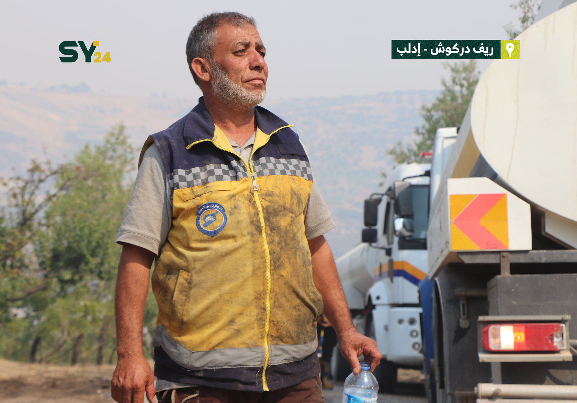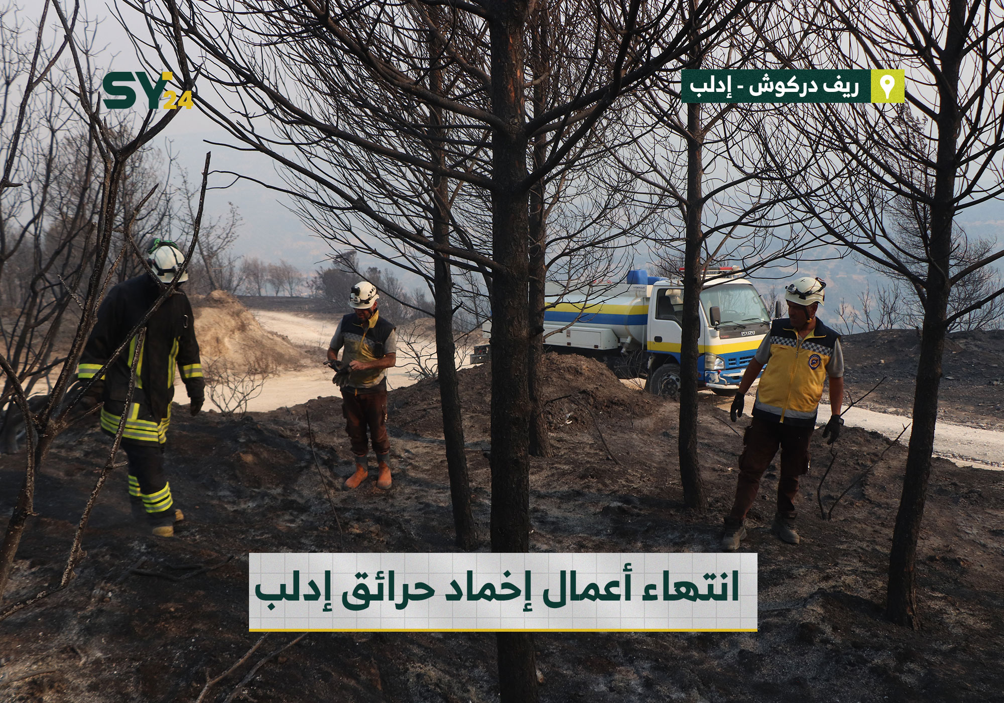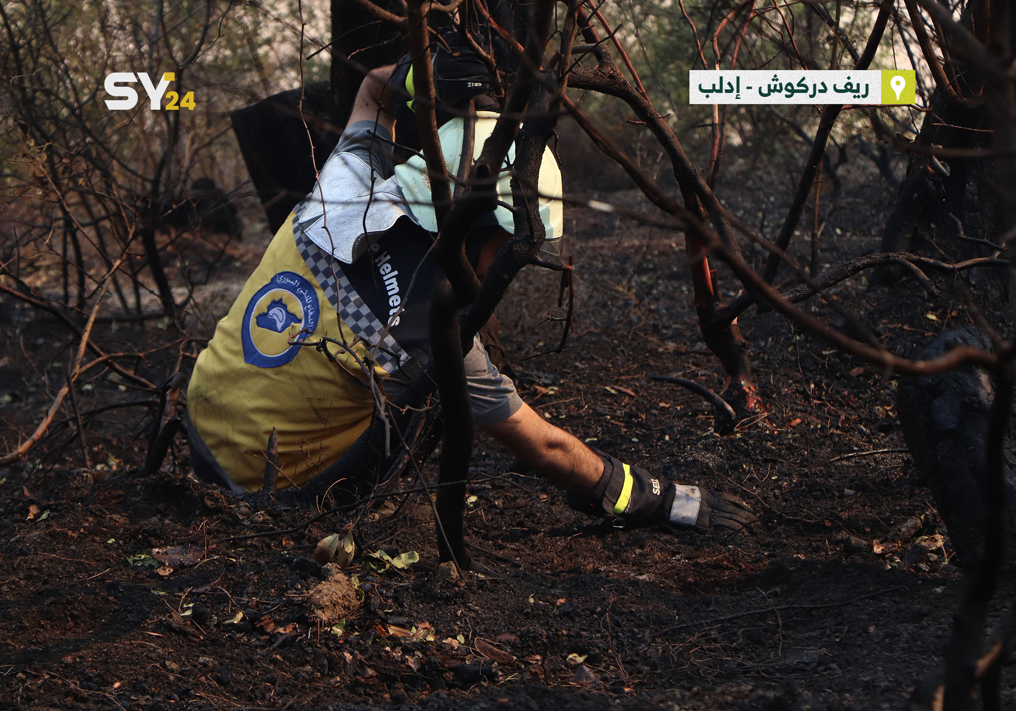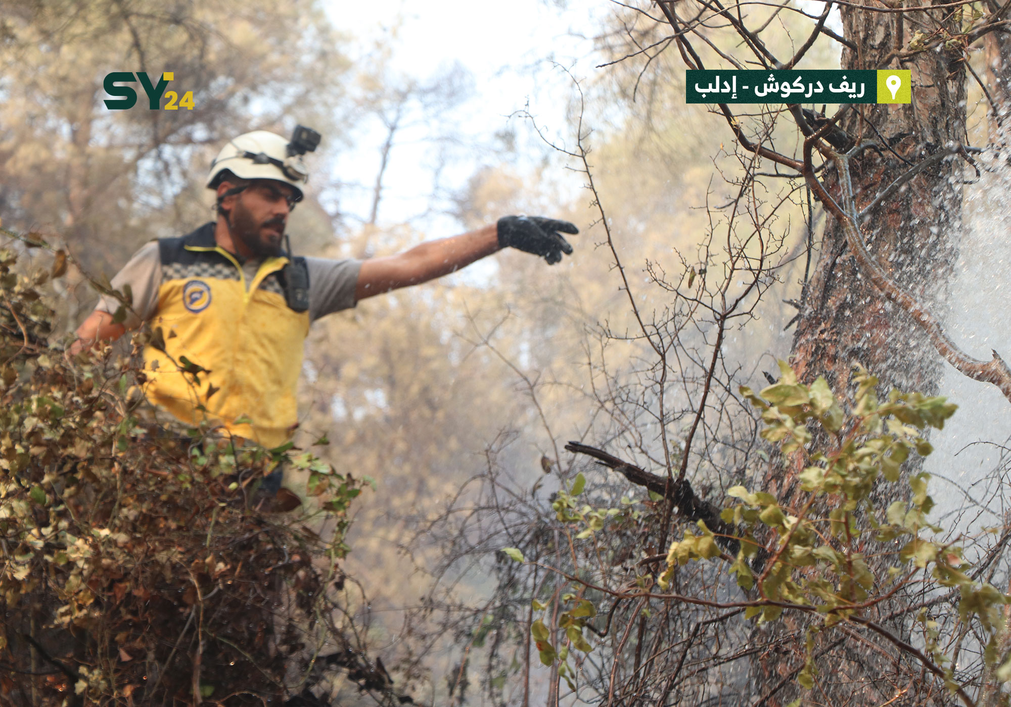 صور تظهر عناصر من الدفاع المدني وهم يخمدون النيران التي اشتعلت في الأحراش والأراضي الزراعية بريف إدلب