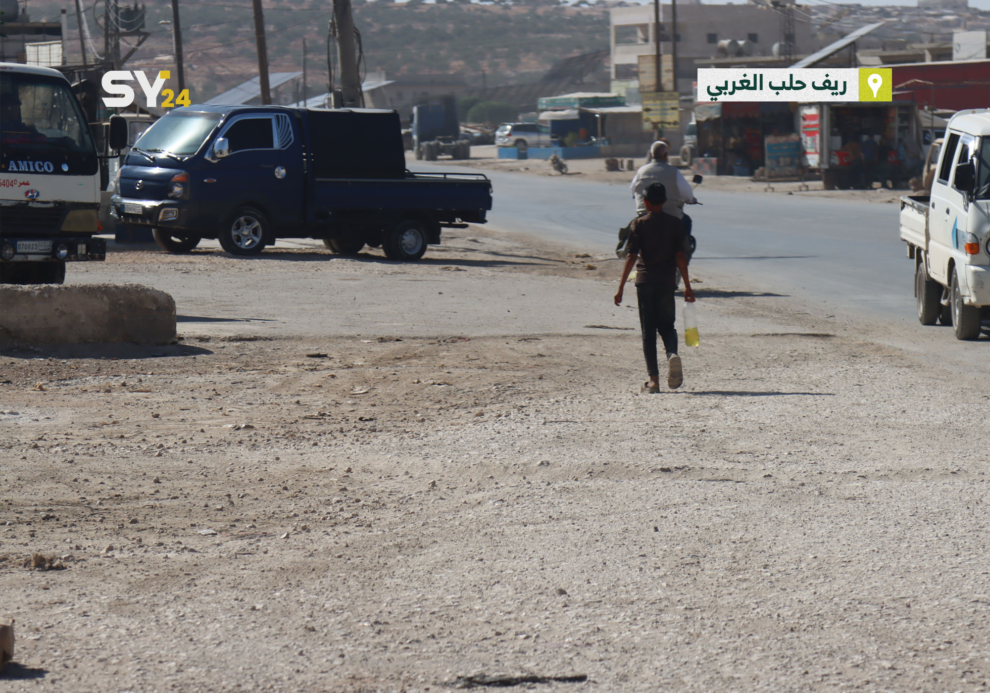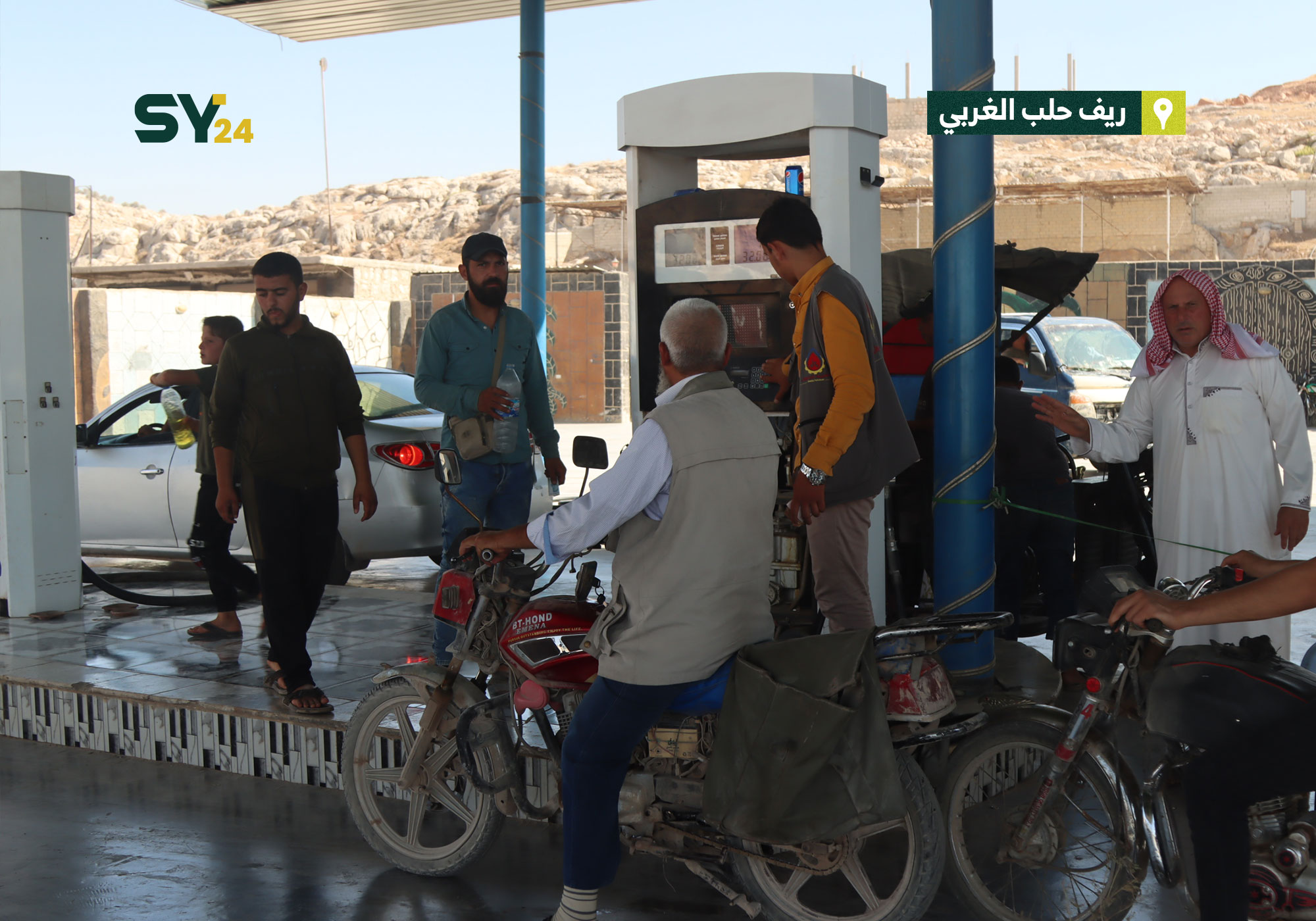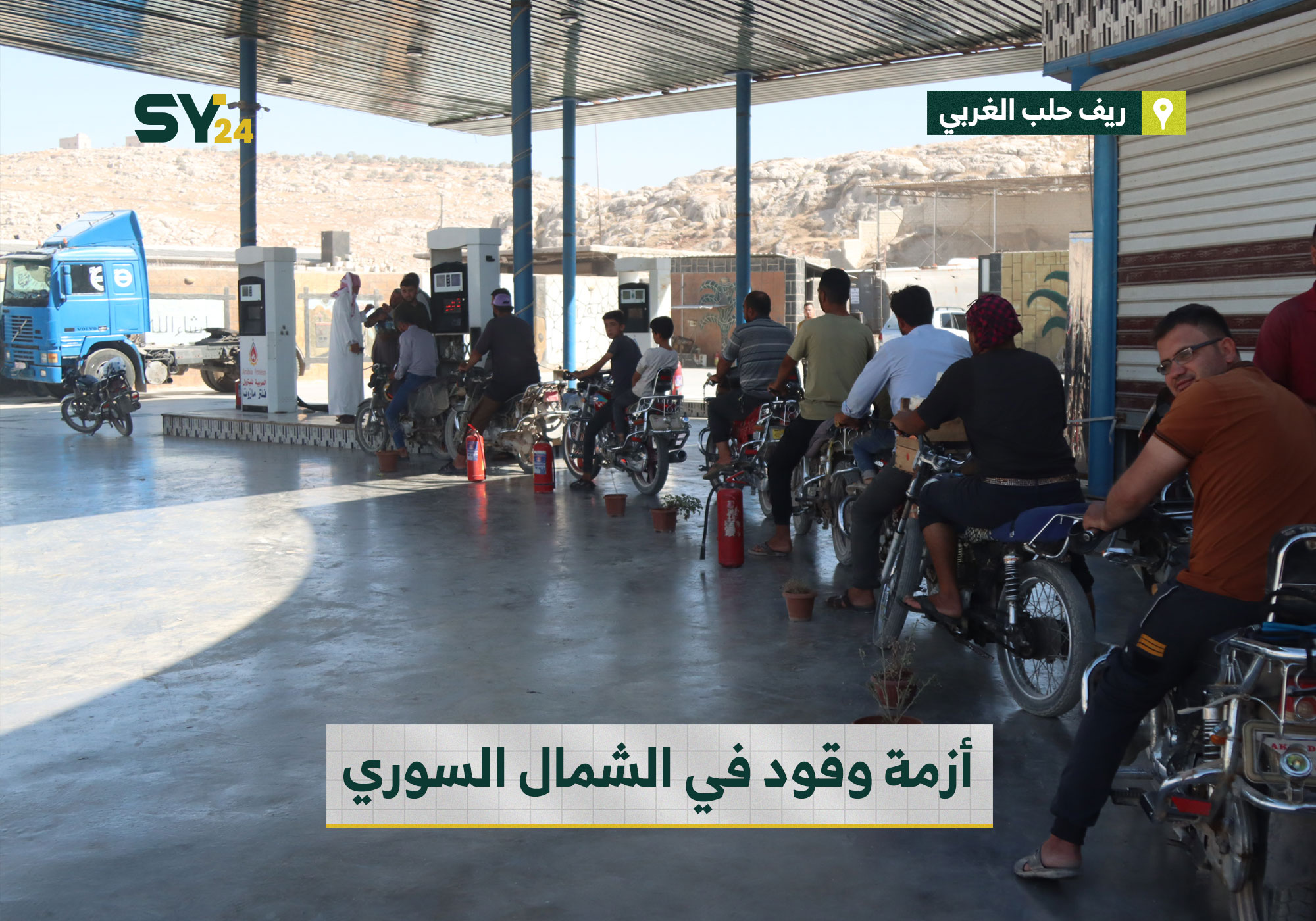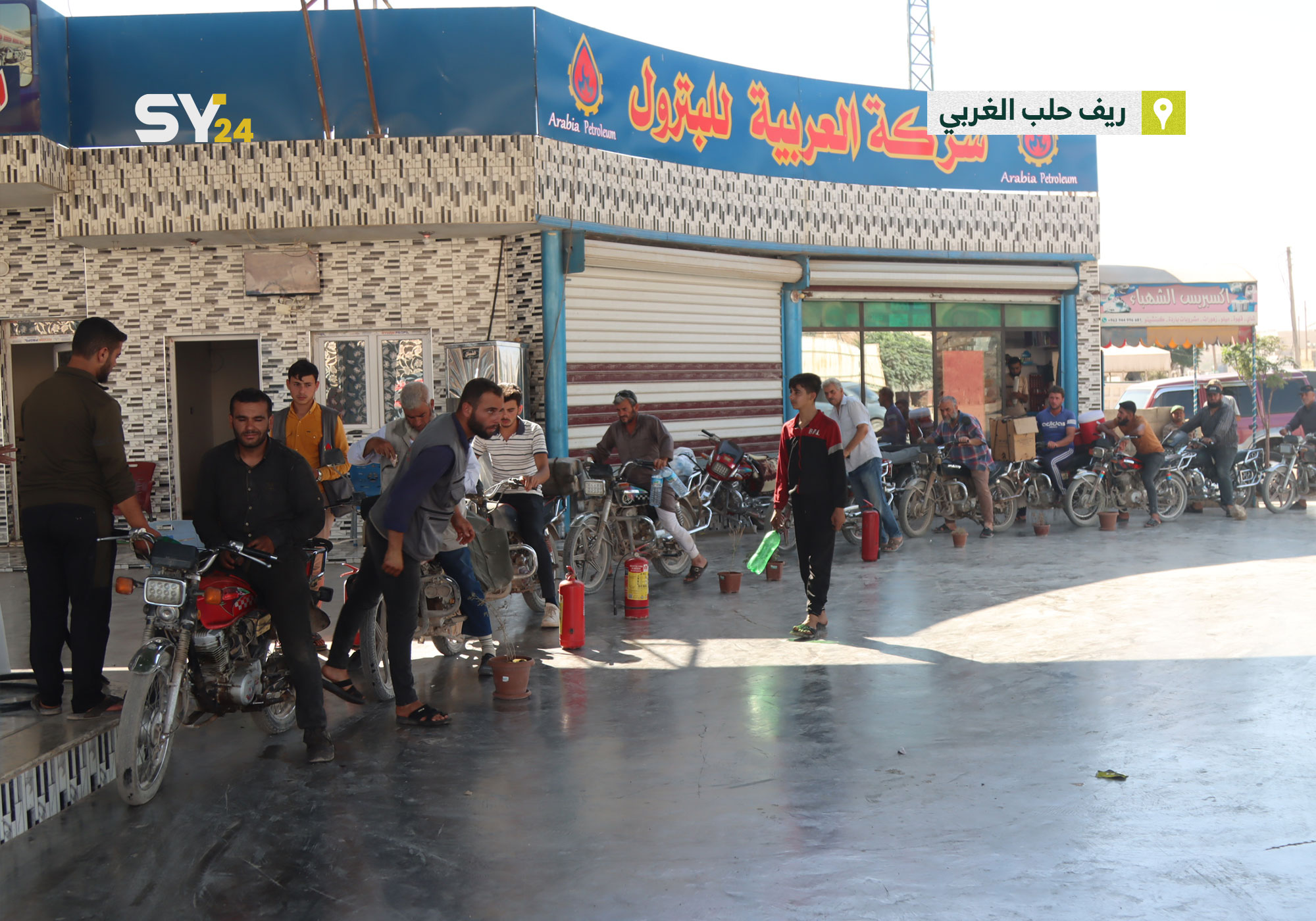 صور لمجموعة من الدراجات النارية تصطف على إحدى محطات الوقود على طريق الدانا – الأتارب بسبب أزمة البنزين التي تشهدها المنطقة