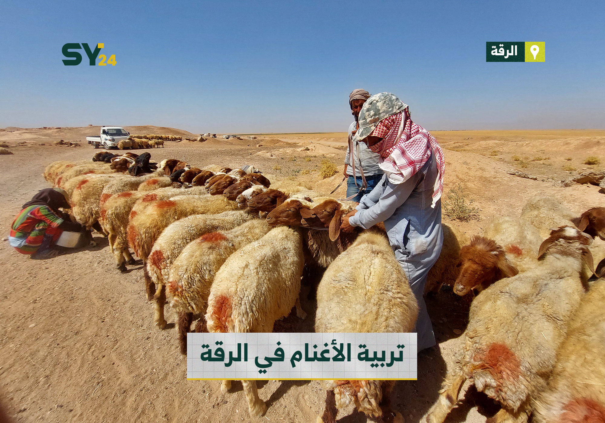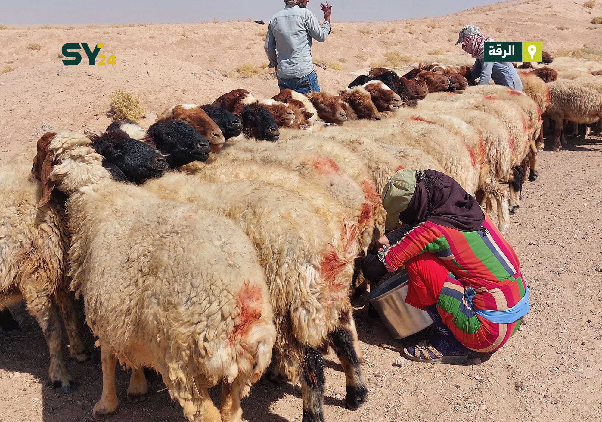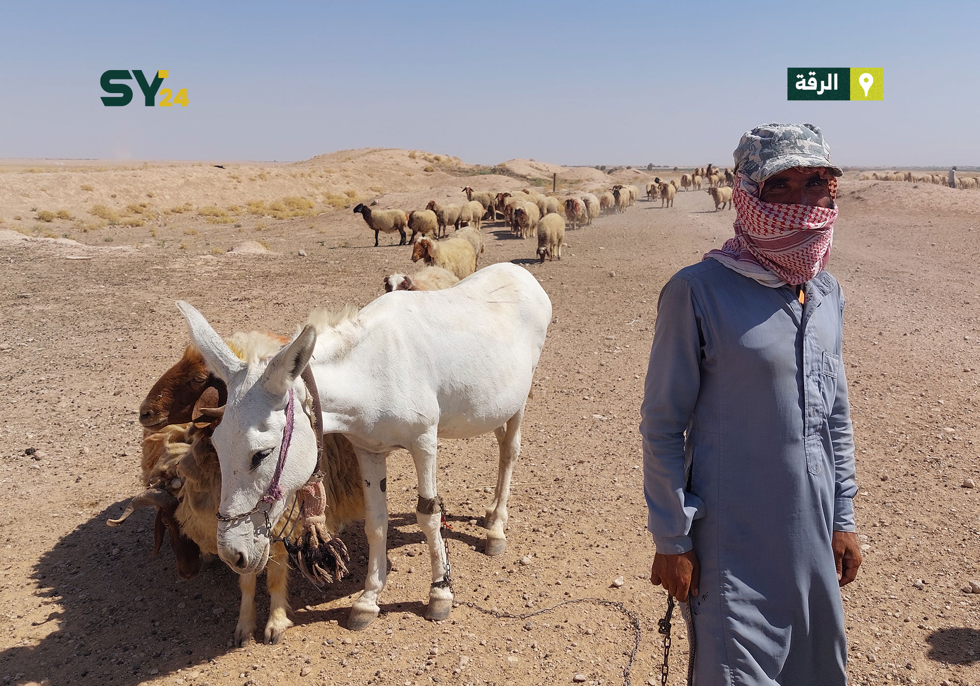 مربو الأغنام يعملون تحت الحر في رعاية أغنامهم بريف الرقة