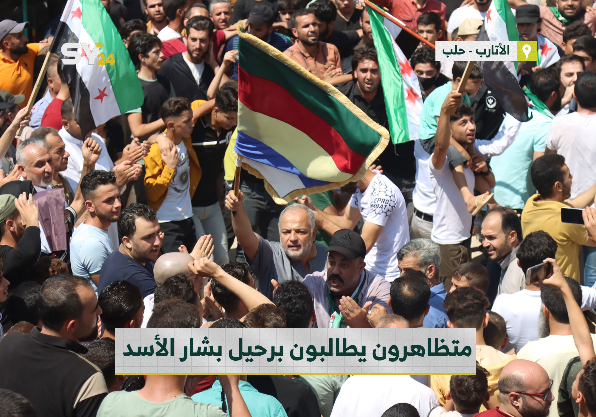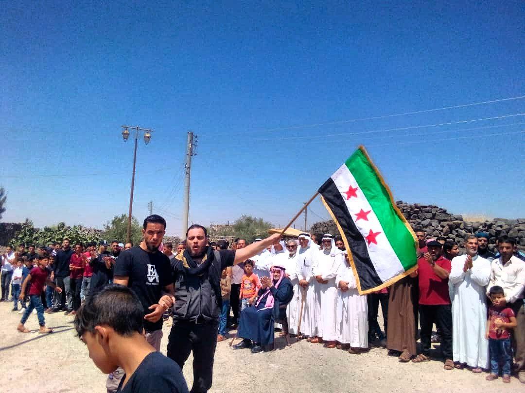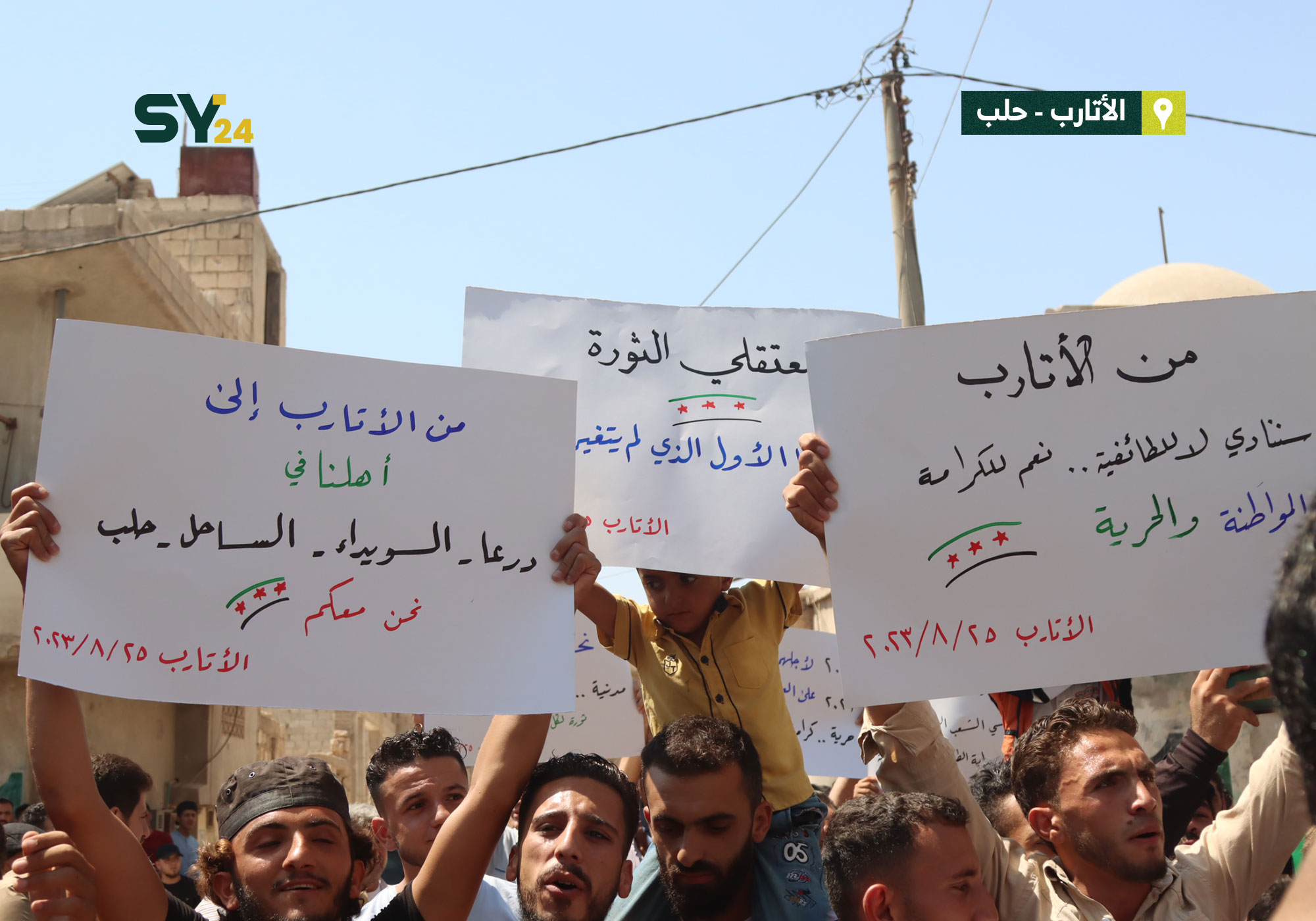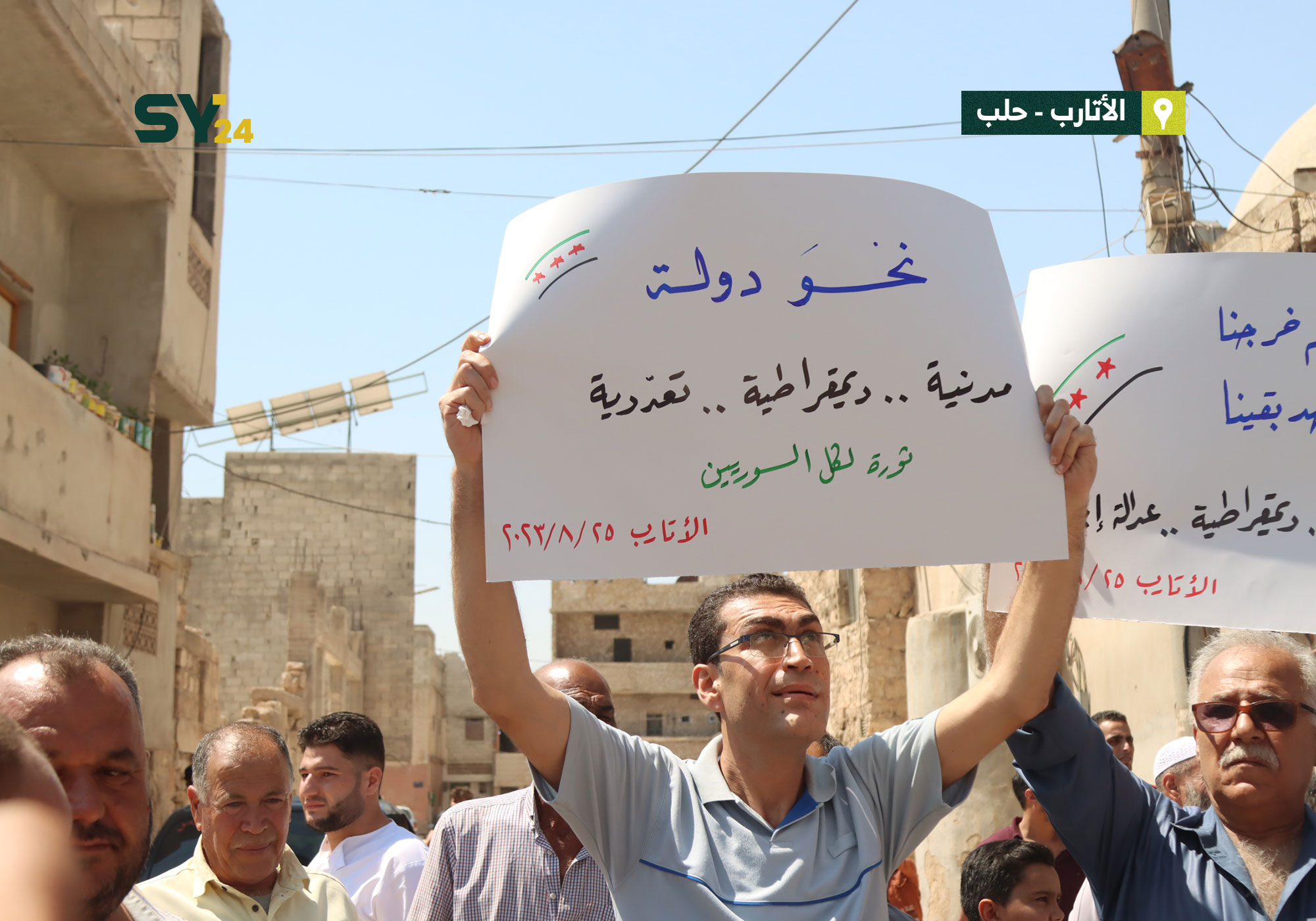 متظاهرون في مدينة الاتارب بريف حلب، يؤكدون دعمهم للحراك الشعبي في الجنوب السوري، ويطالبون بإسقاط النظام.