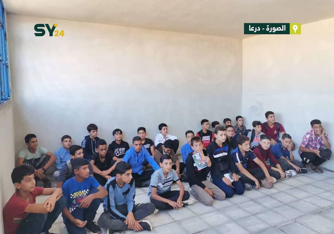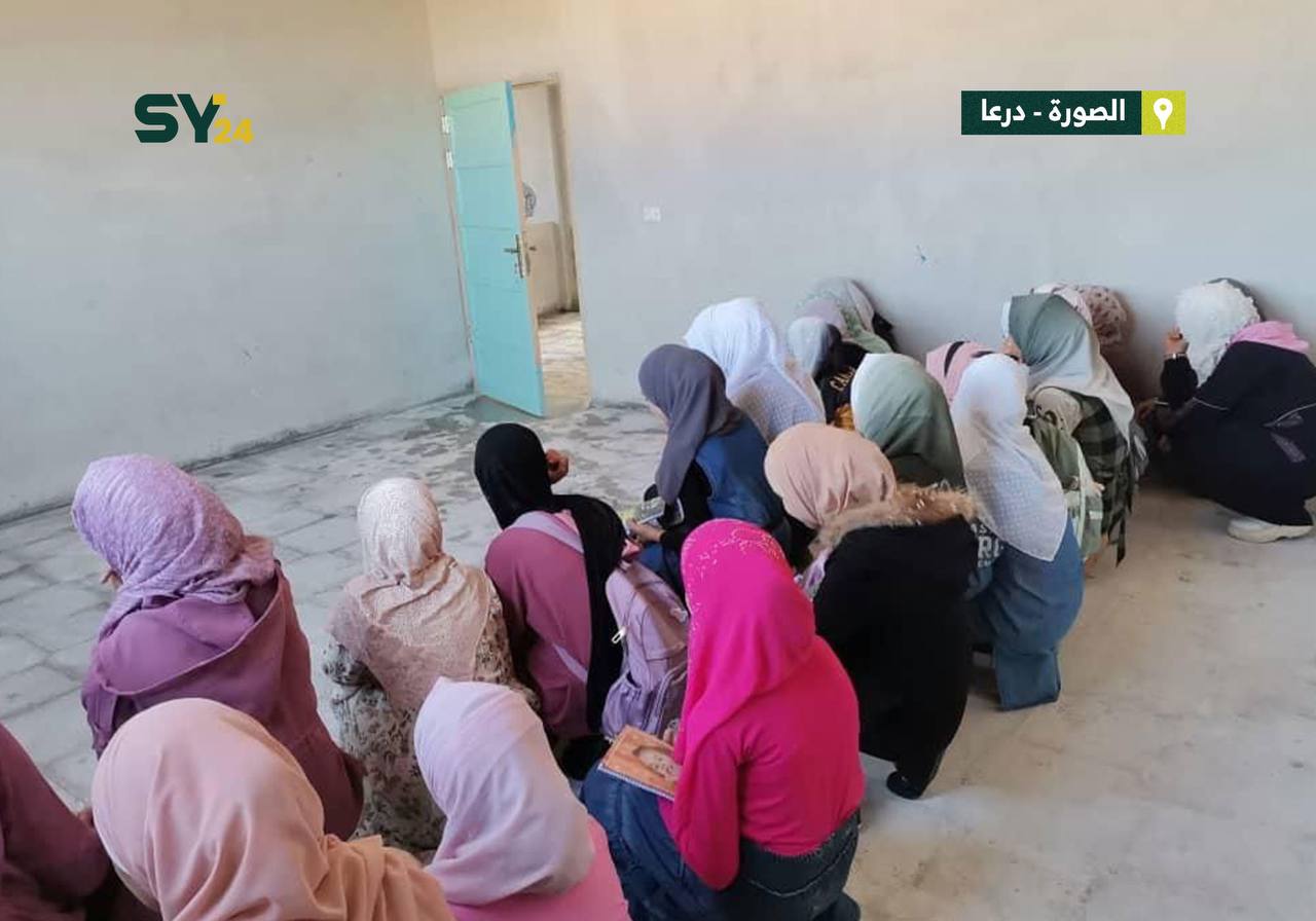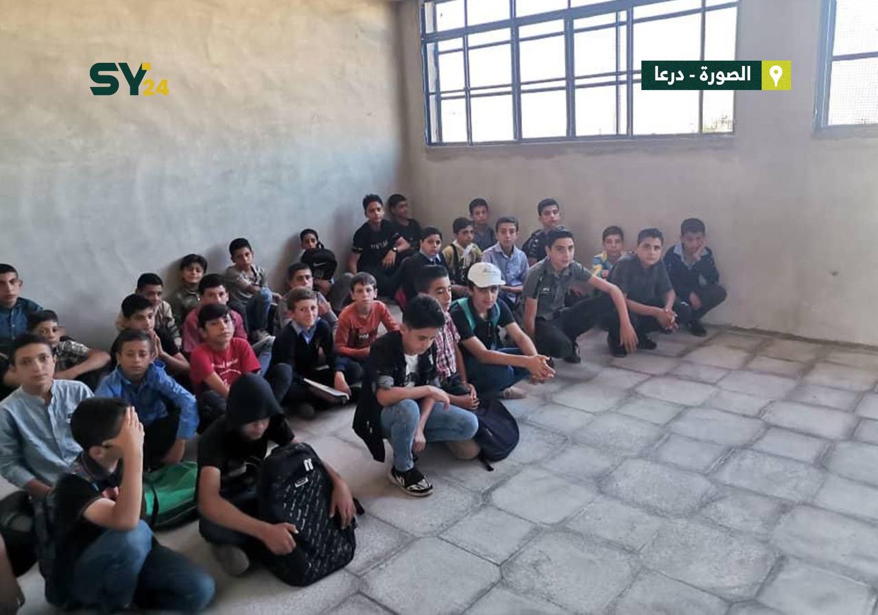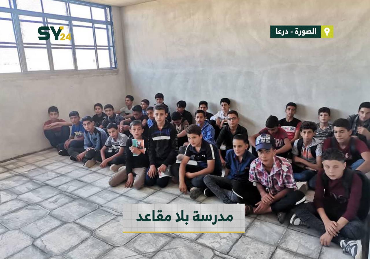 بدء العام الدراسي الجديد في مدرسة الصورة بريف درعا دون توفير مقاعد دراسية للطلاب من قبل مديرية التربية.