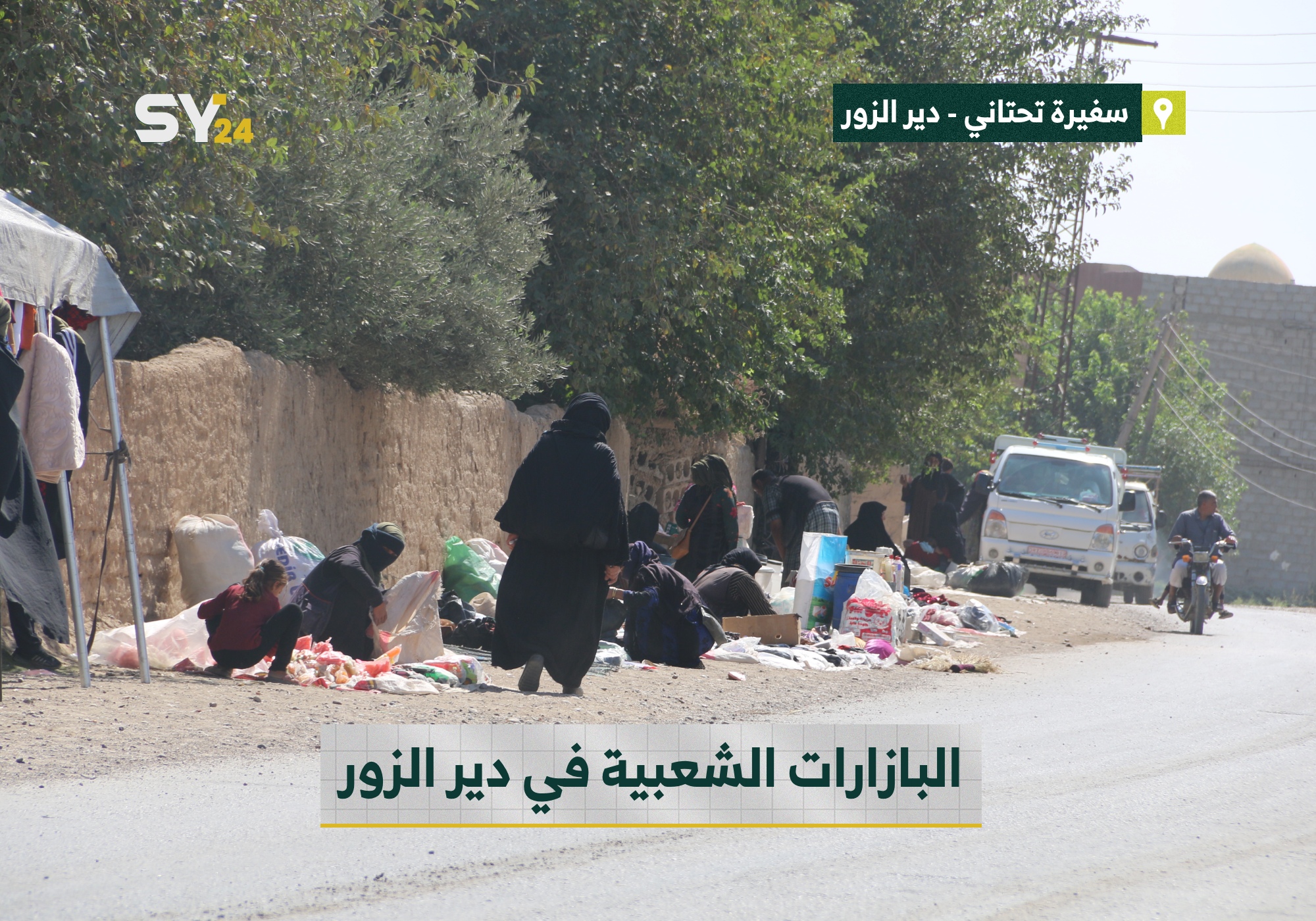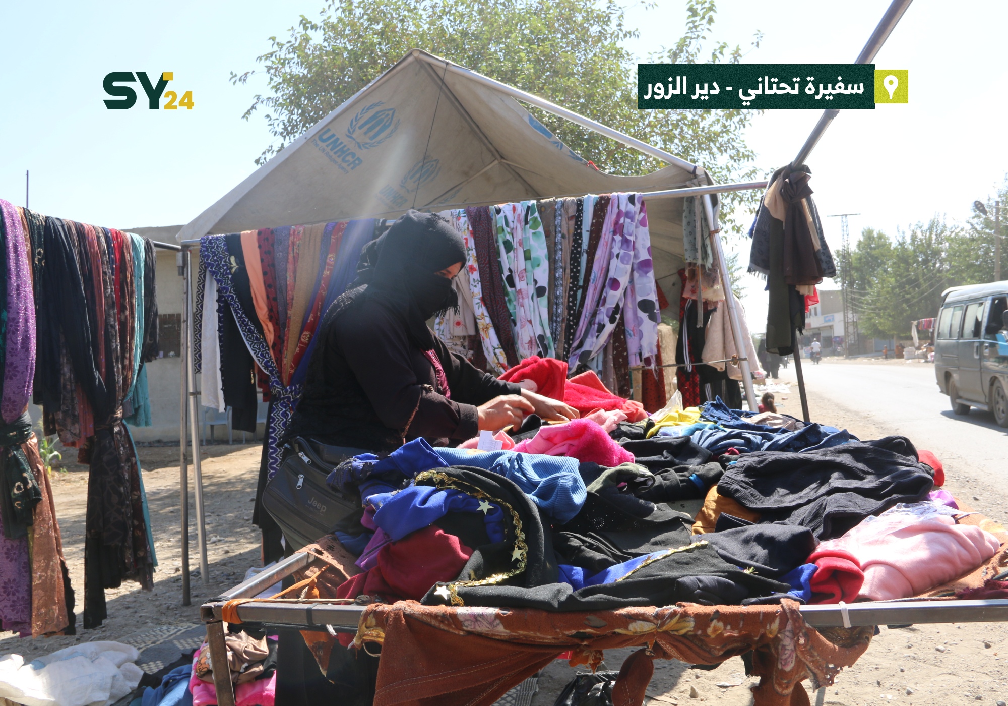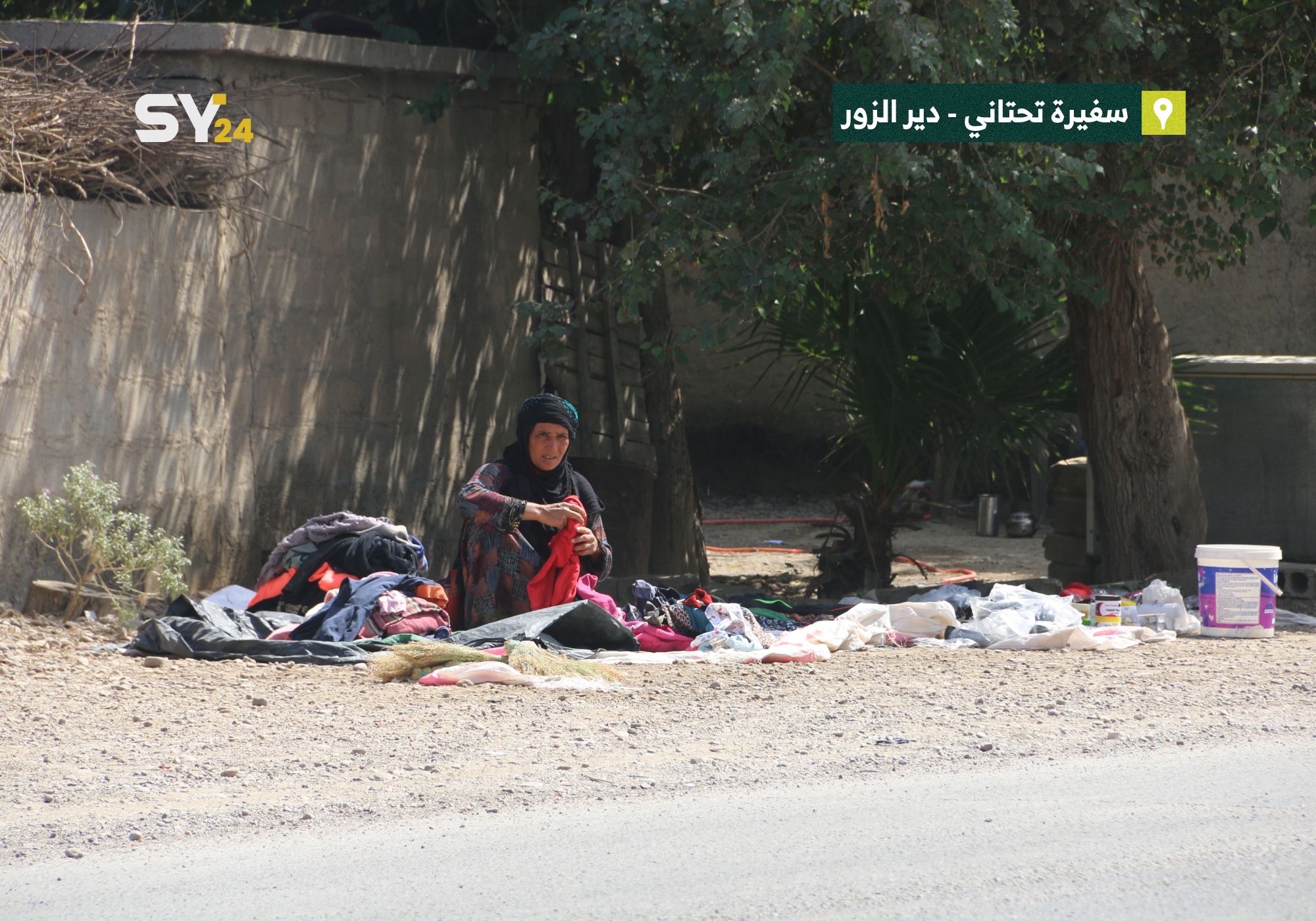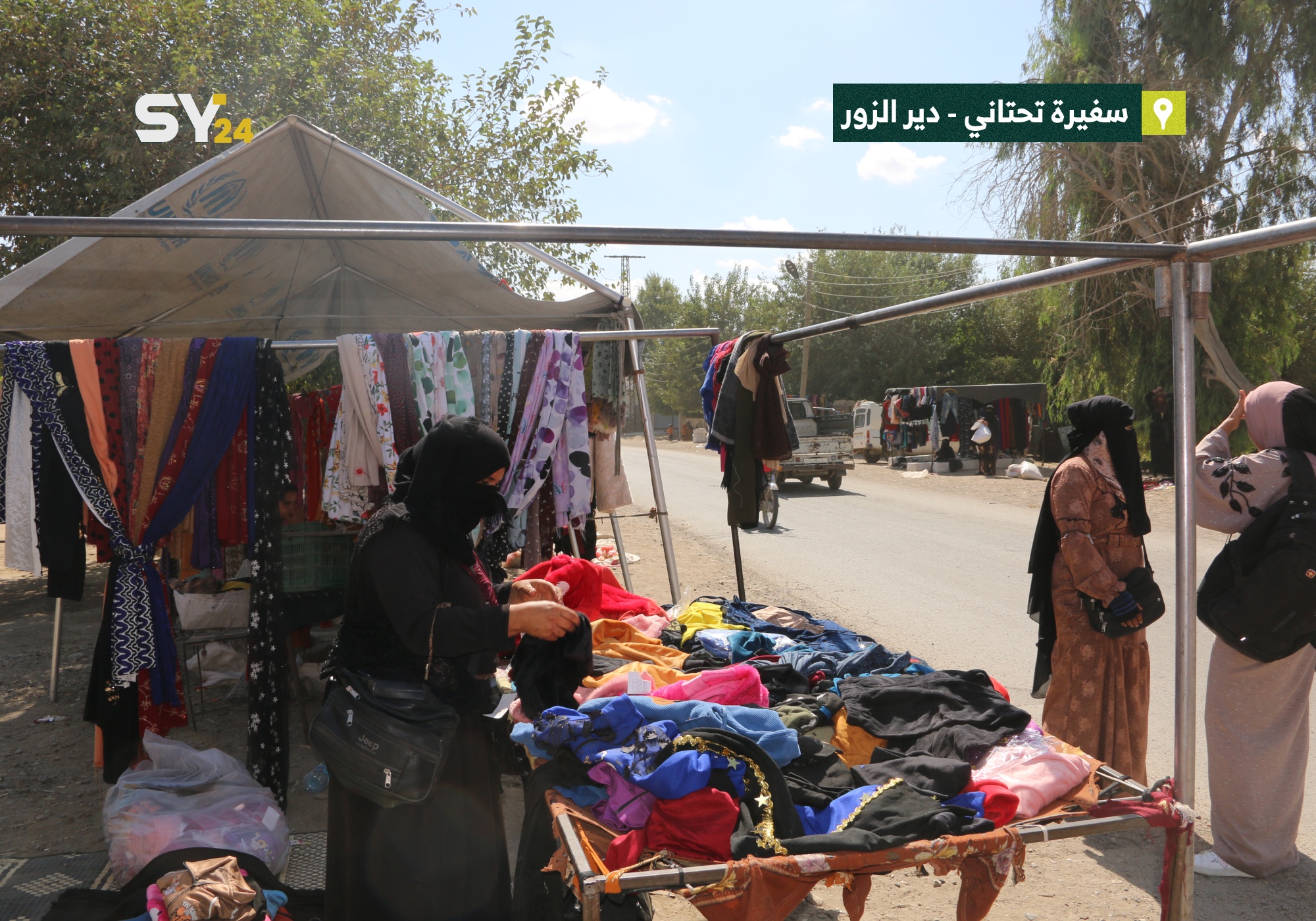 أحد الأسواق الشعبية المتنقلة ويُسمى “البازار” يظهر فيه مجموعة من النساء اللواتي يعلن أسرهن في ريف دير الزور
