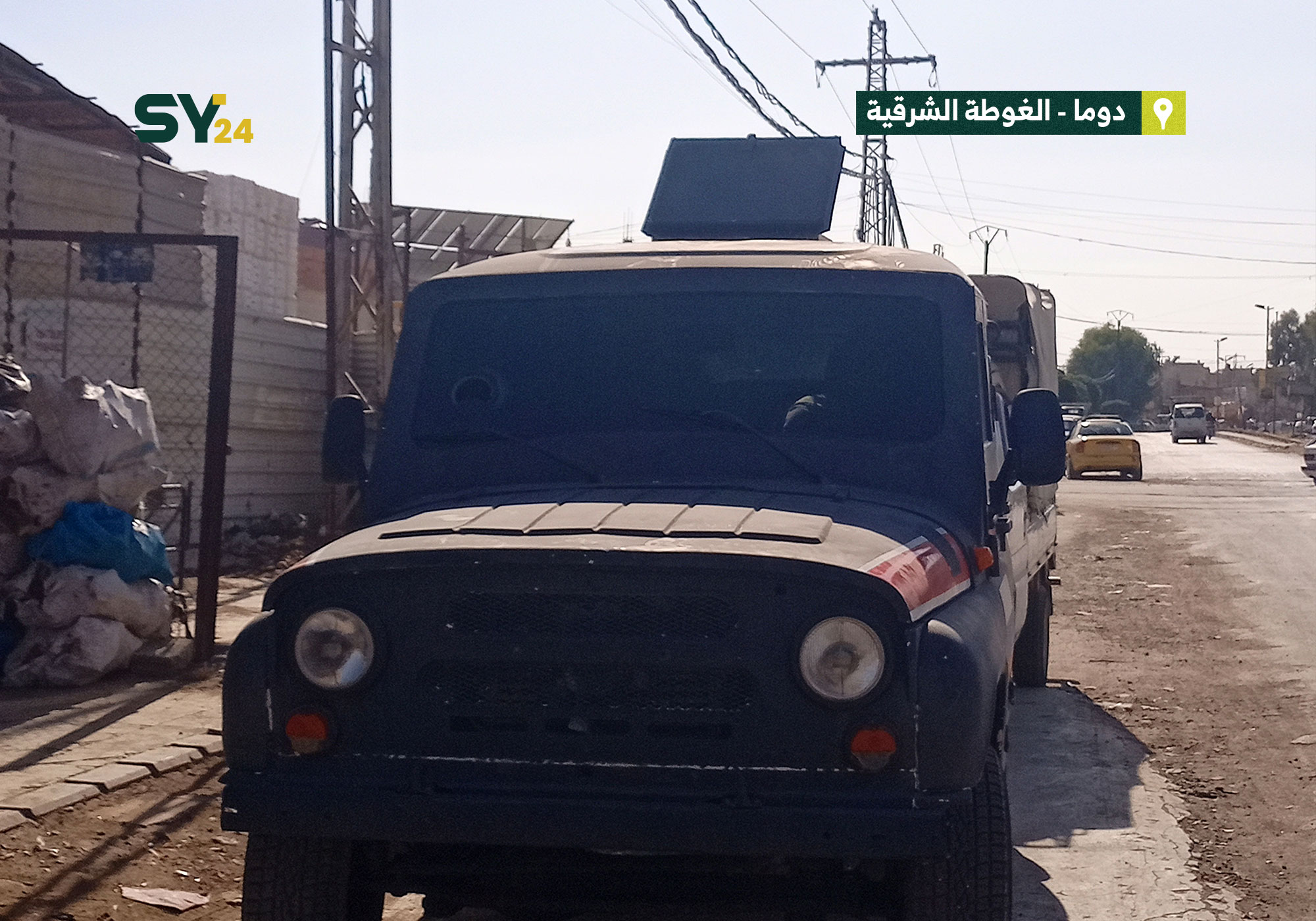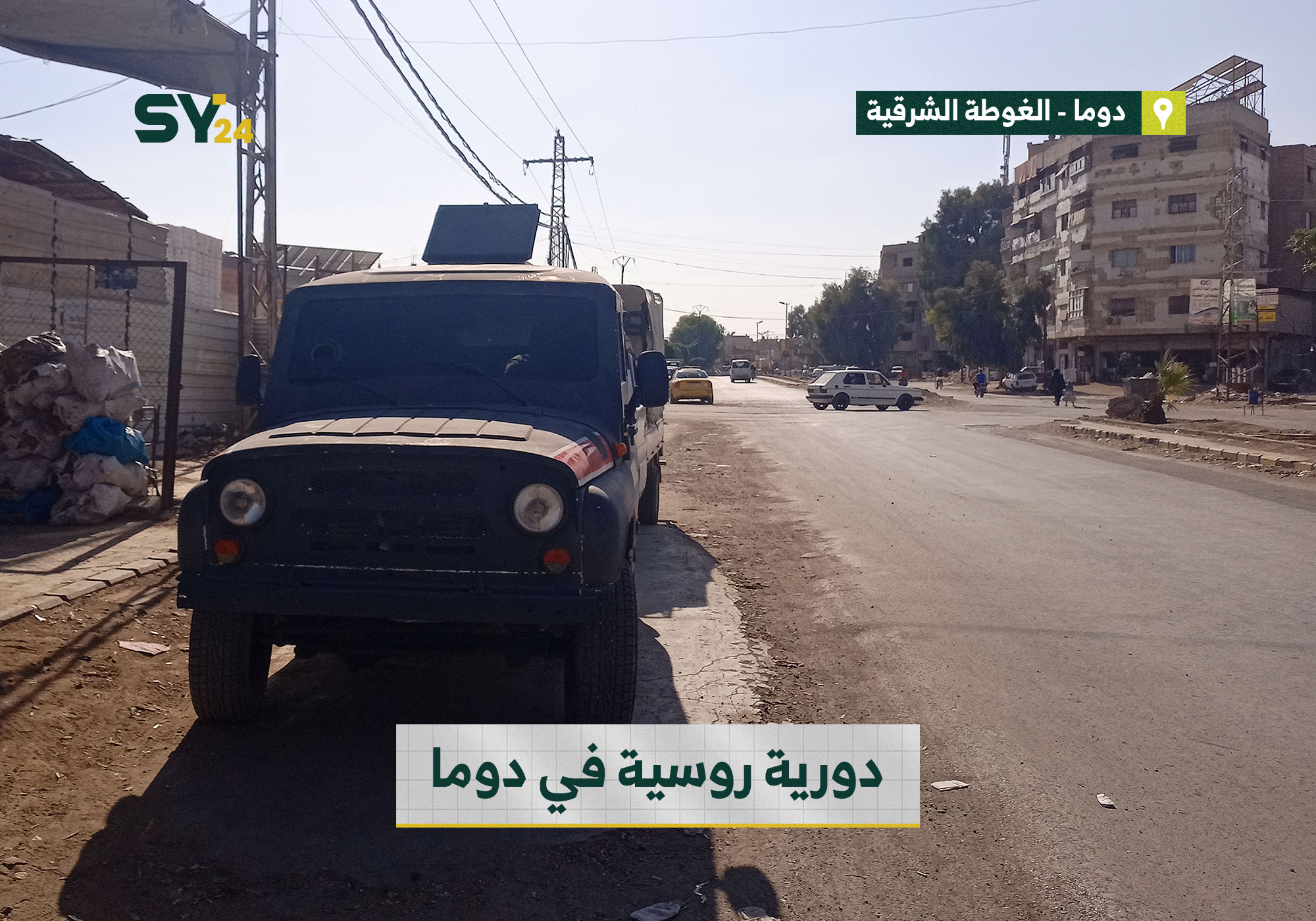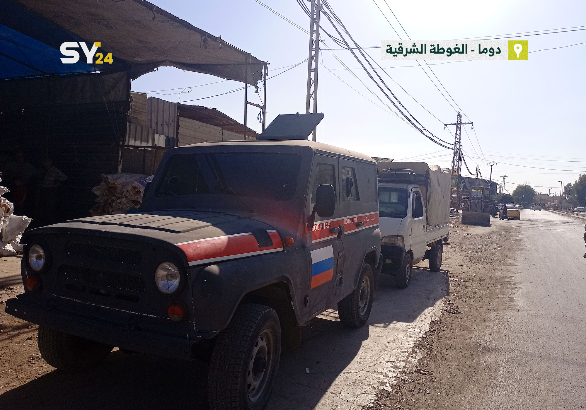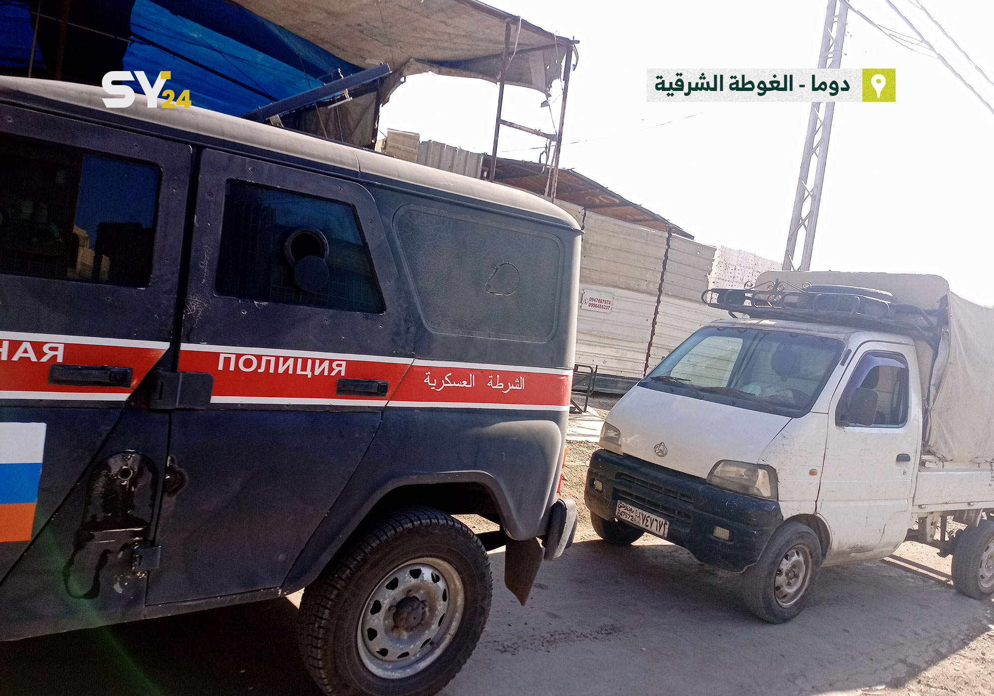 سيارات تابعة للشرطة العسكرية الروسية تتجول داخل أحياء مدينة دوما في غوطة دمشق.