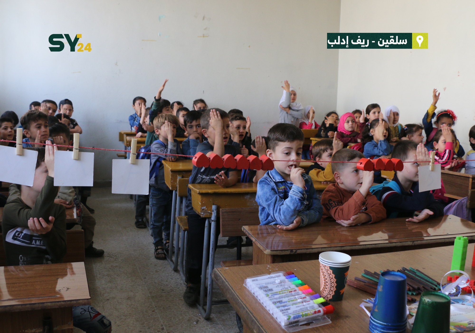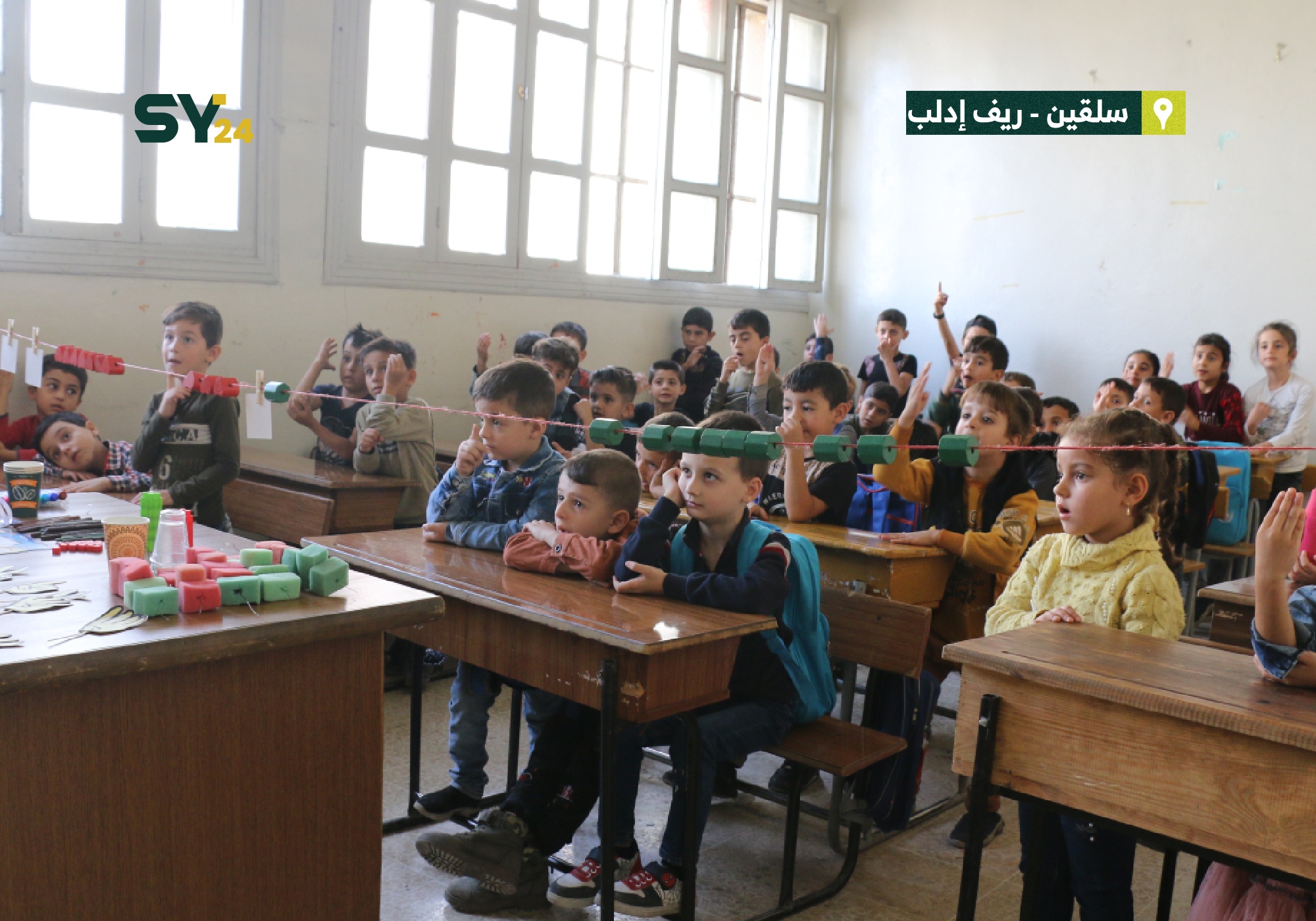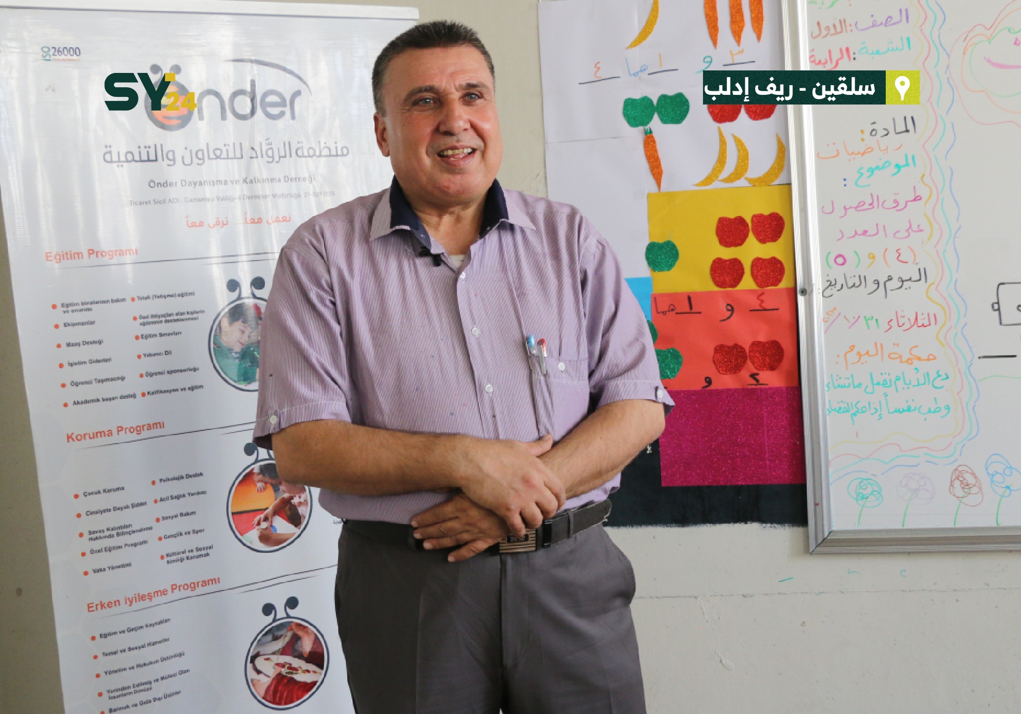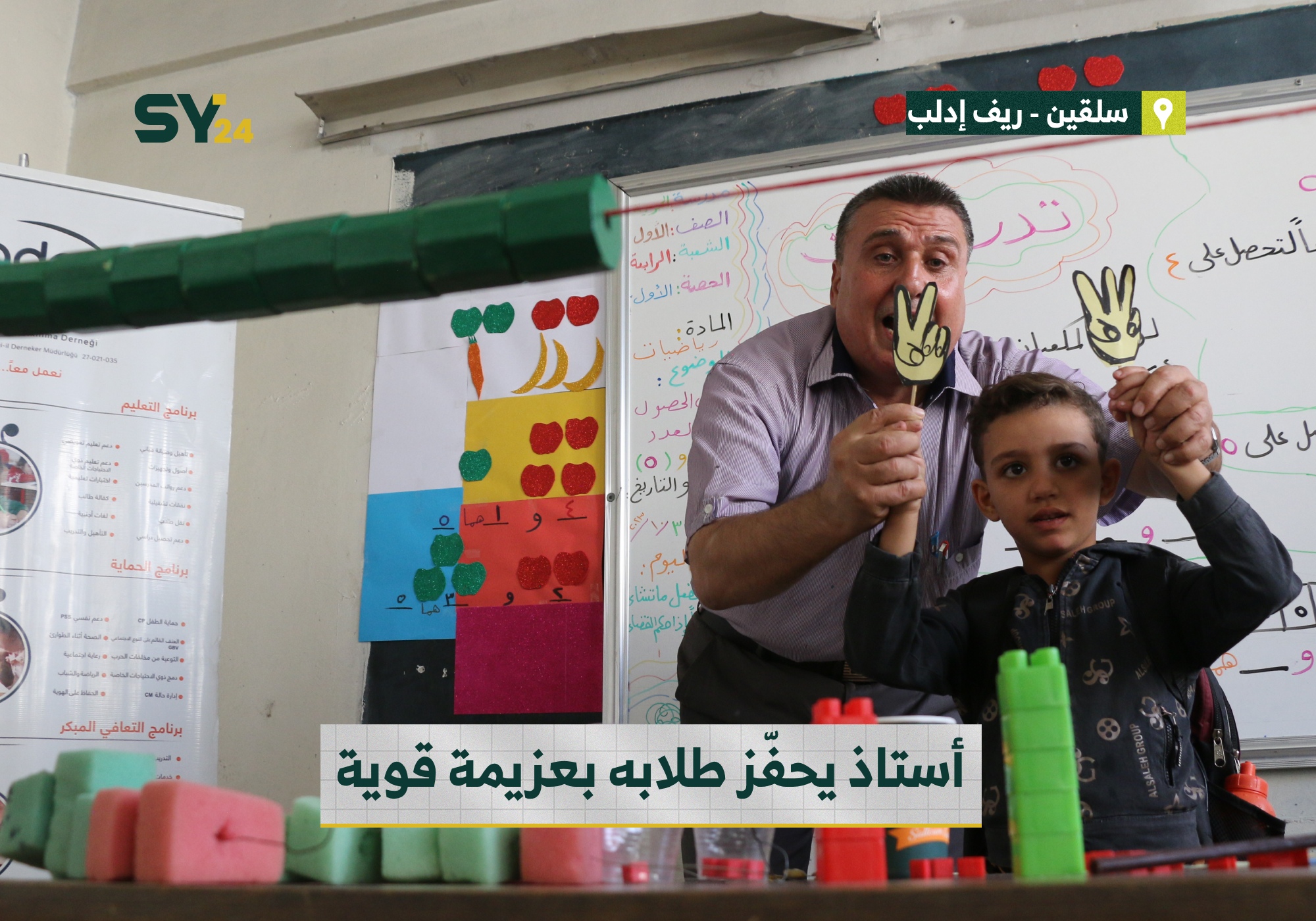 بعزيمة قوية وعطاء غير منقطع يبدع الأستاذ غياث ملندي في طريقة تدريسه في إحدى مدارس مدينة سلقين بريف إدلب.