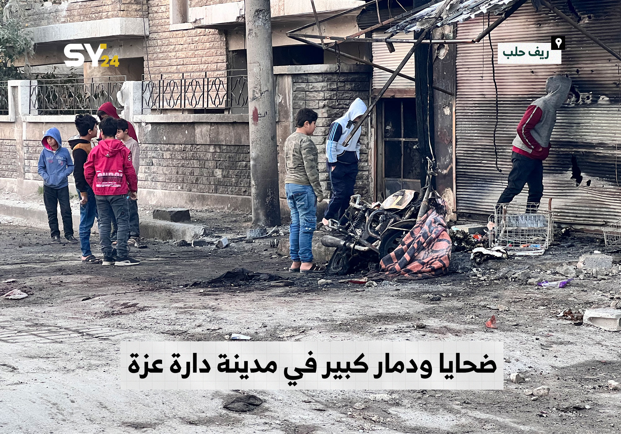 آثار الدمار في مدينة دارة عزة بريف حلب الغربي، جراء القصف الذي نفذته قوات النظام وراح ضحيته 5 قتلى وعدد من الجرحى.