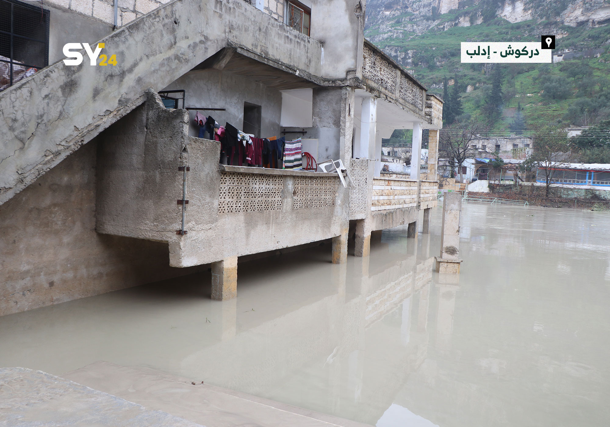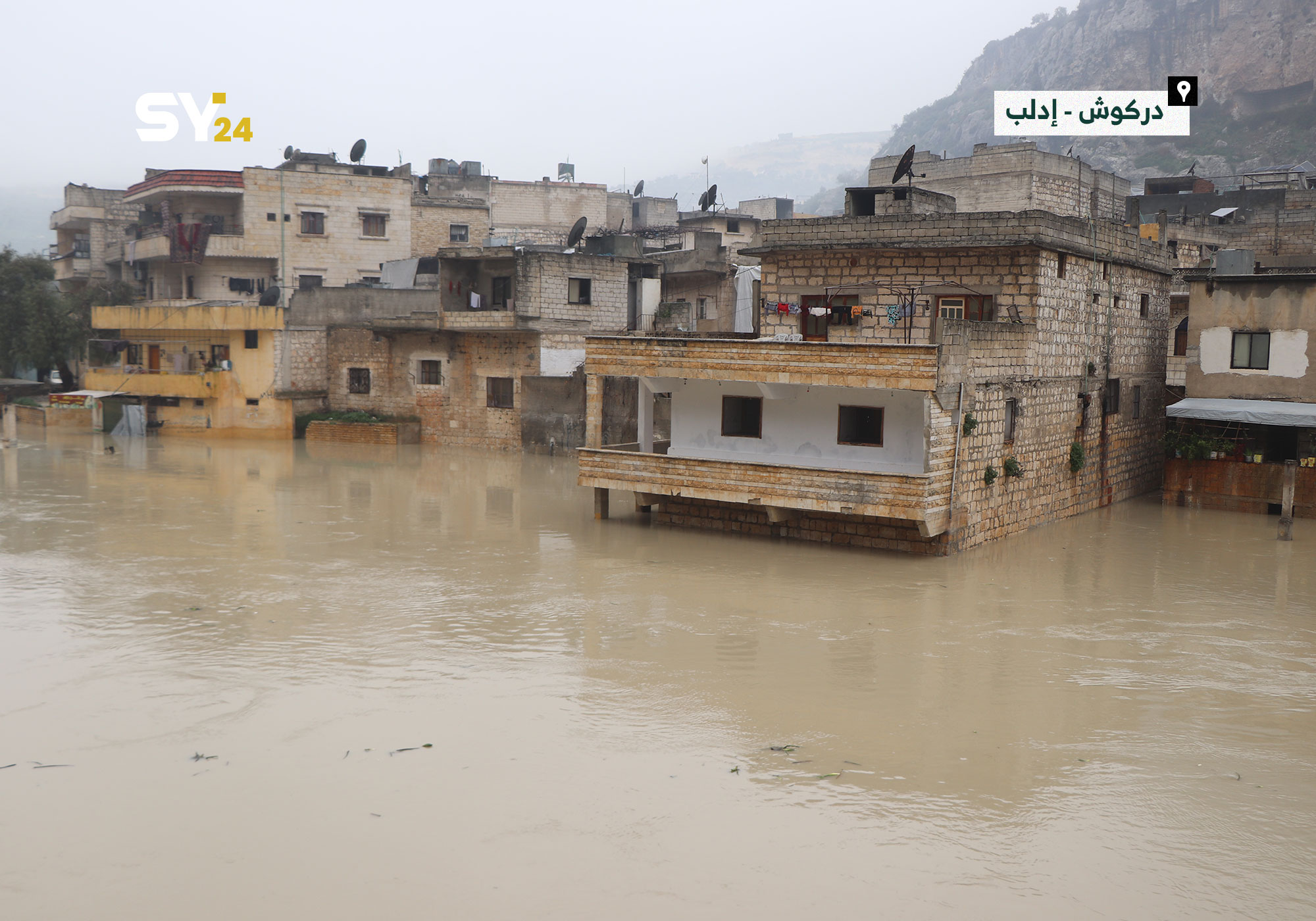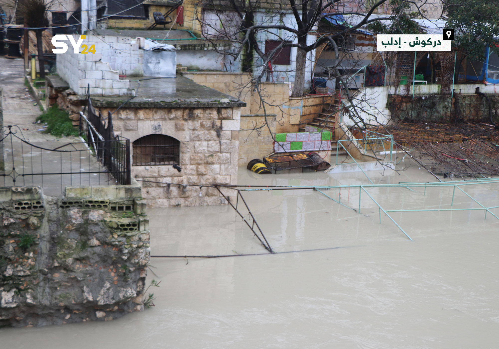 غرق بعض المنازل والمطاعم على أطراف نهر العاصي في منطقة دركوش بريف إدلب، بعد ارتفاع منسوب مياه النهر جراء العاصفة المطرية التي ضربت المنطقة.