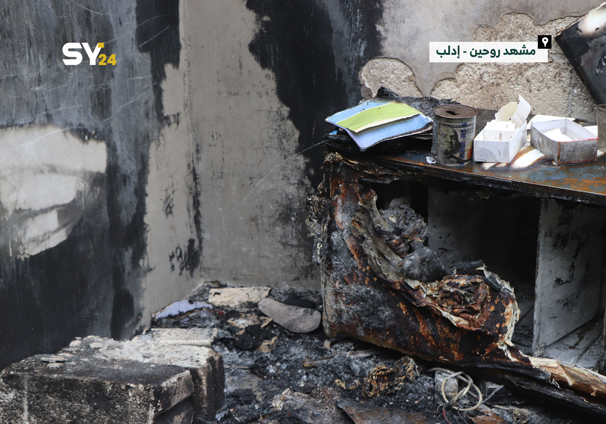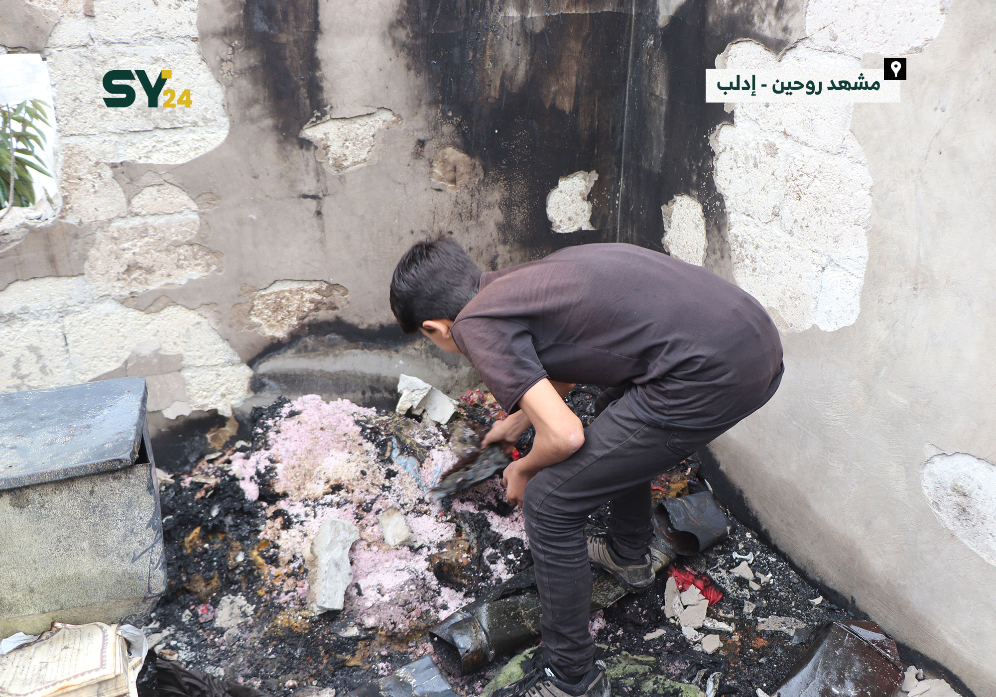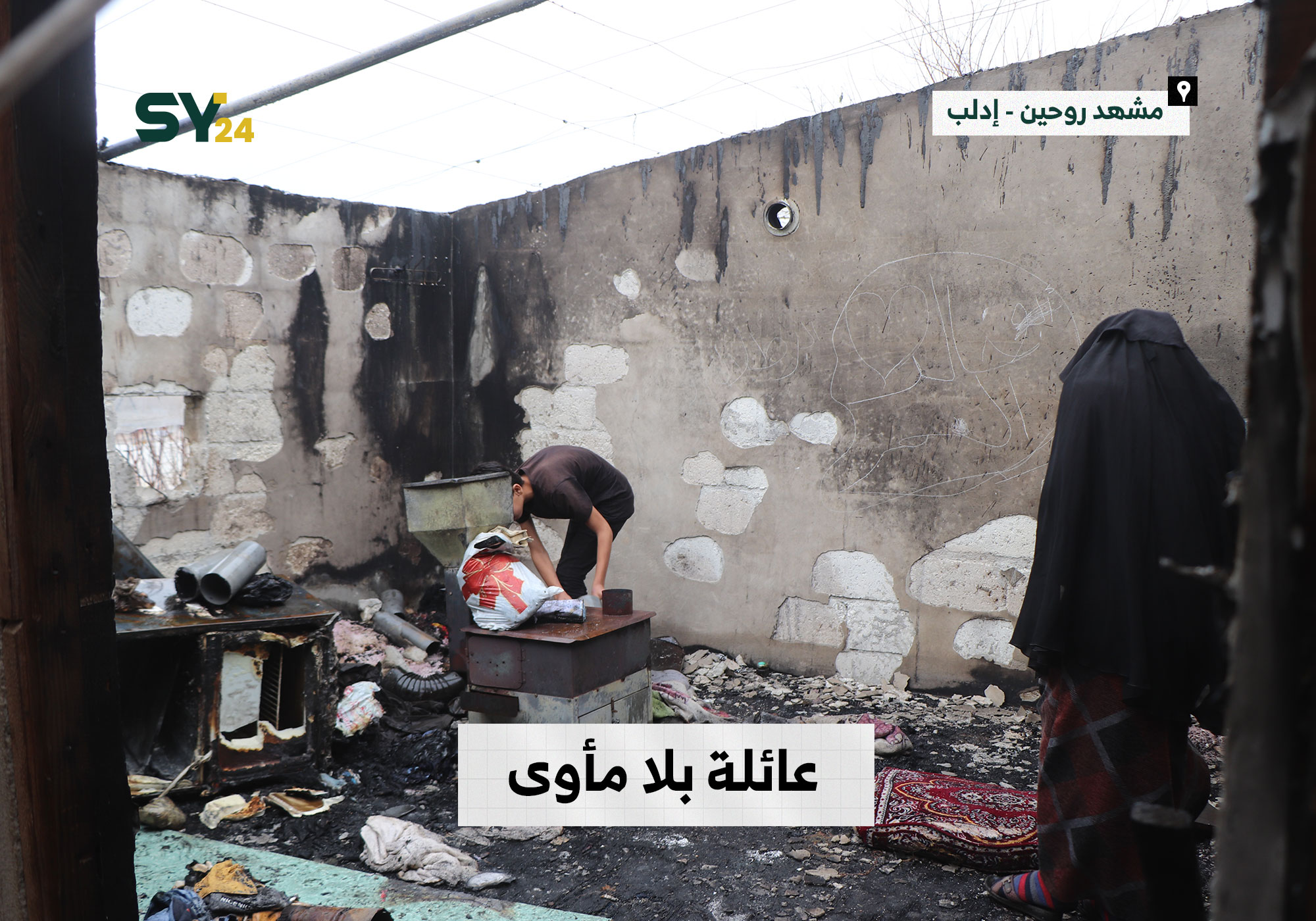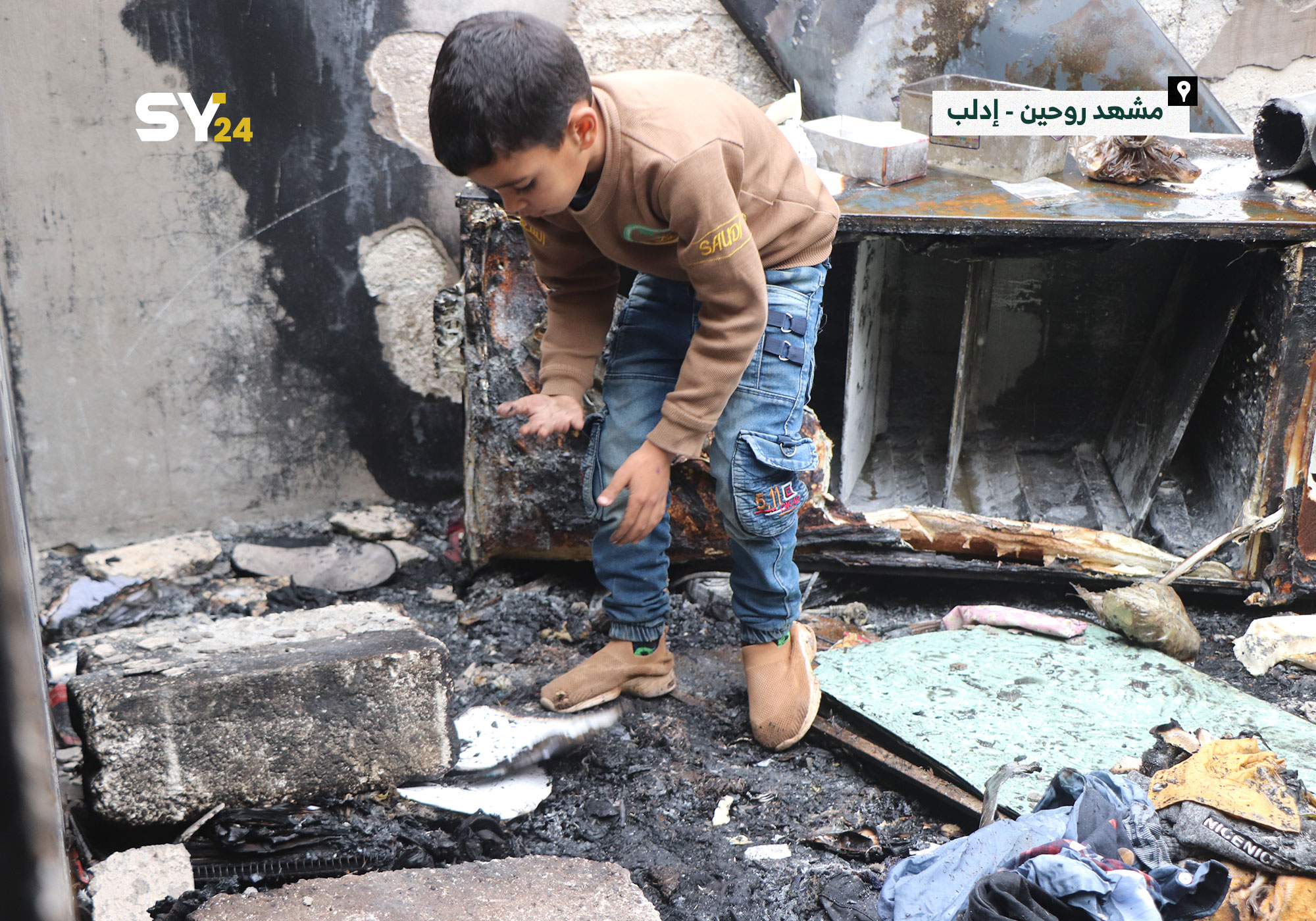 نجاة أم وأطفالها الأربعة من حريق دمر خيمتهم في أحد مخيمات مشهد روحين بريف إدلب.
