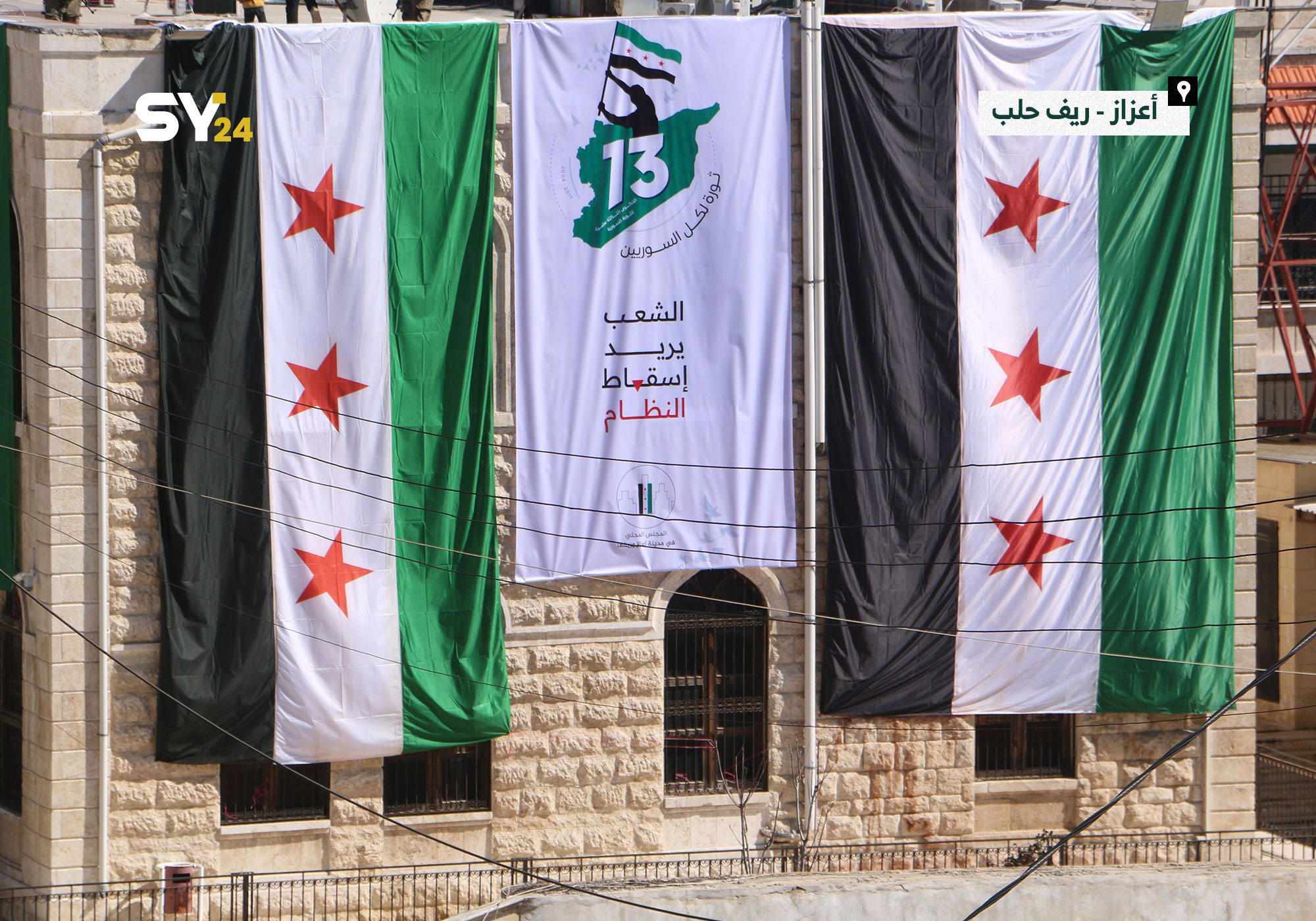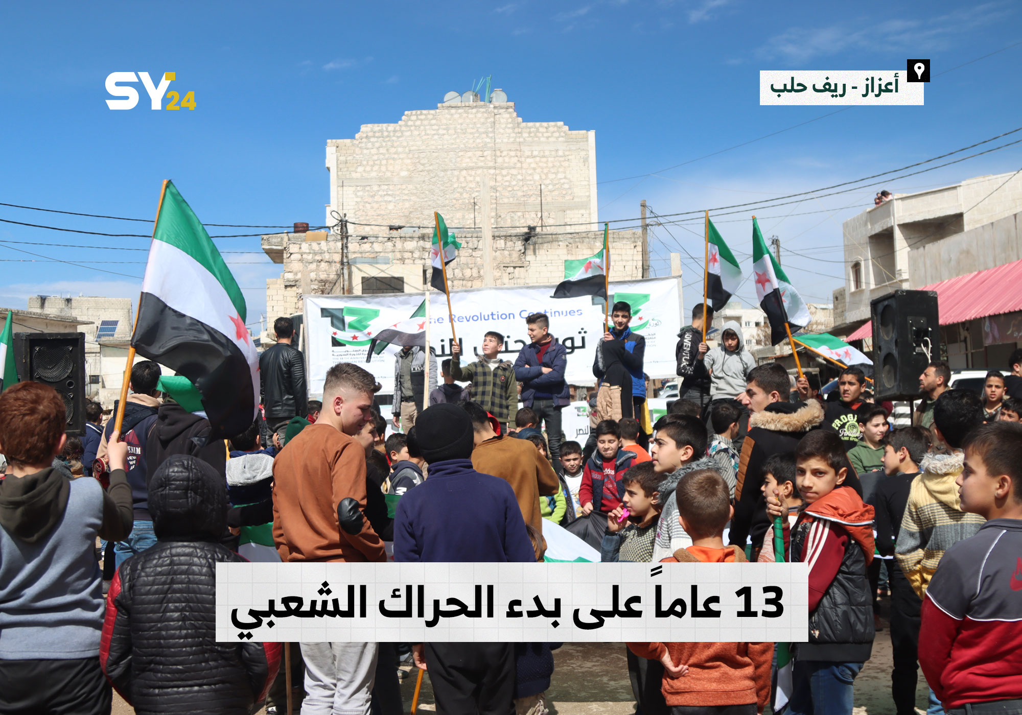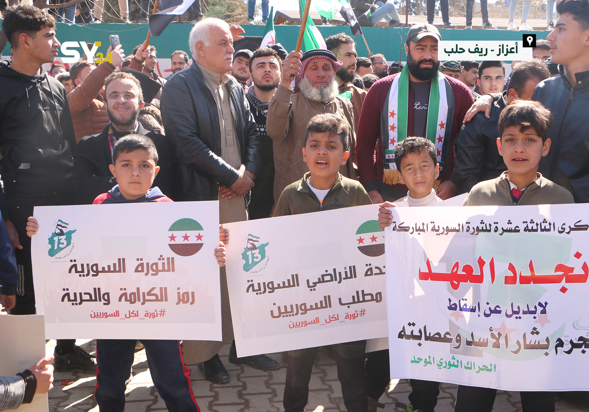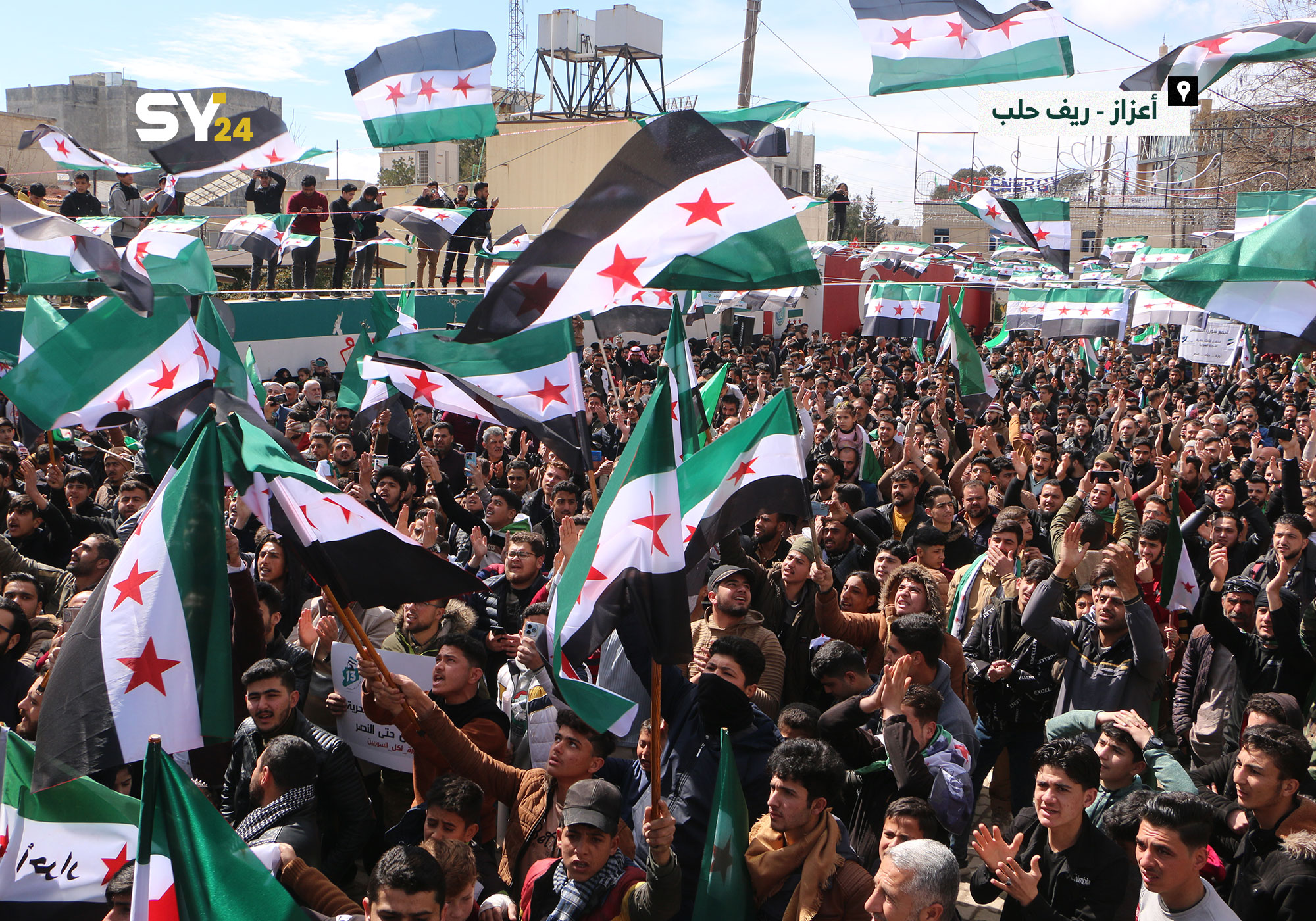 مظاهرة في مدينة أعزاز بريف حلب تطالب بالحرية وإسقاط النظام في ذكرى الثورة السورية