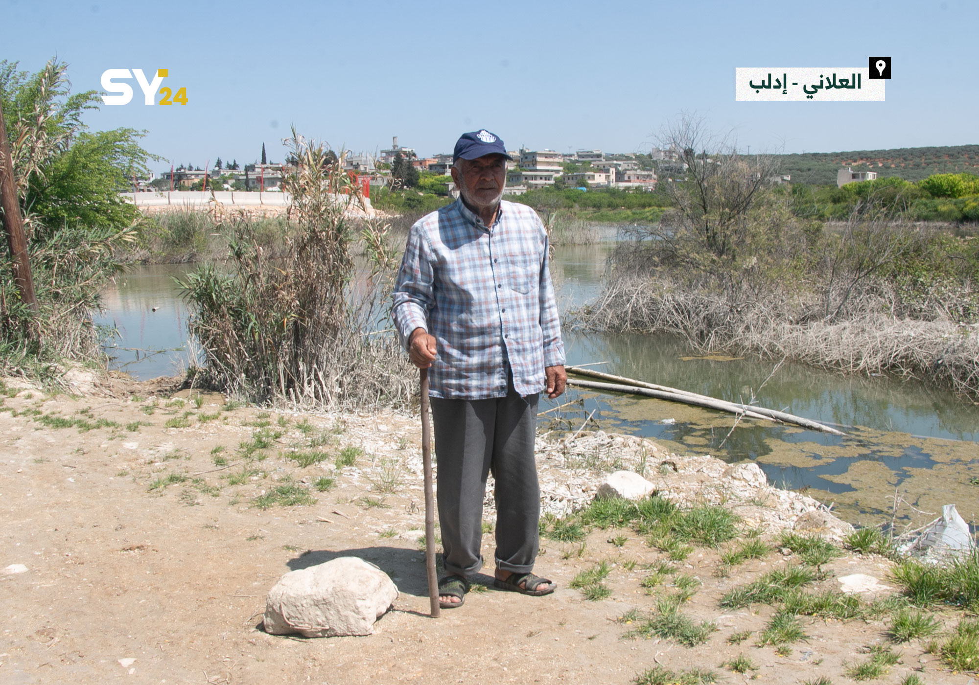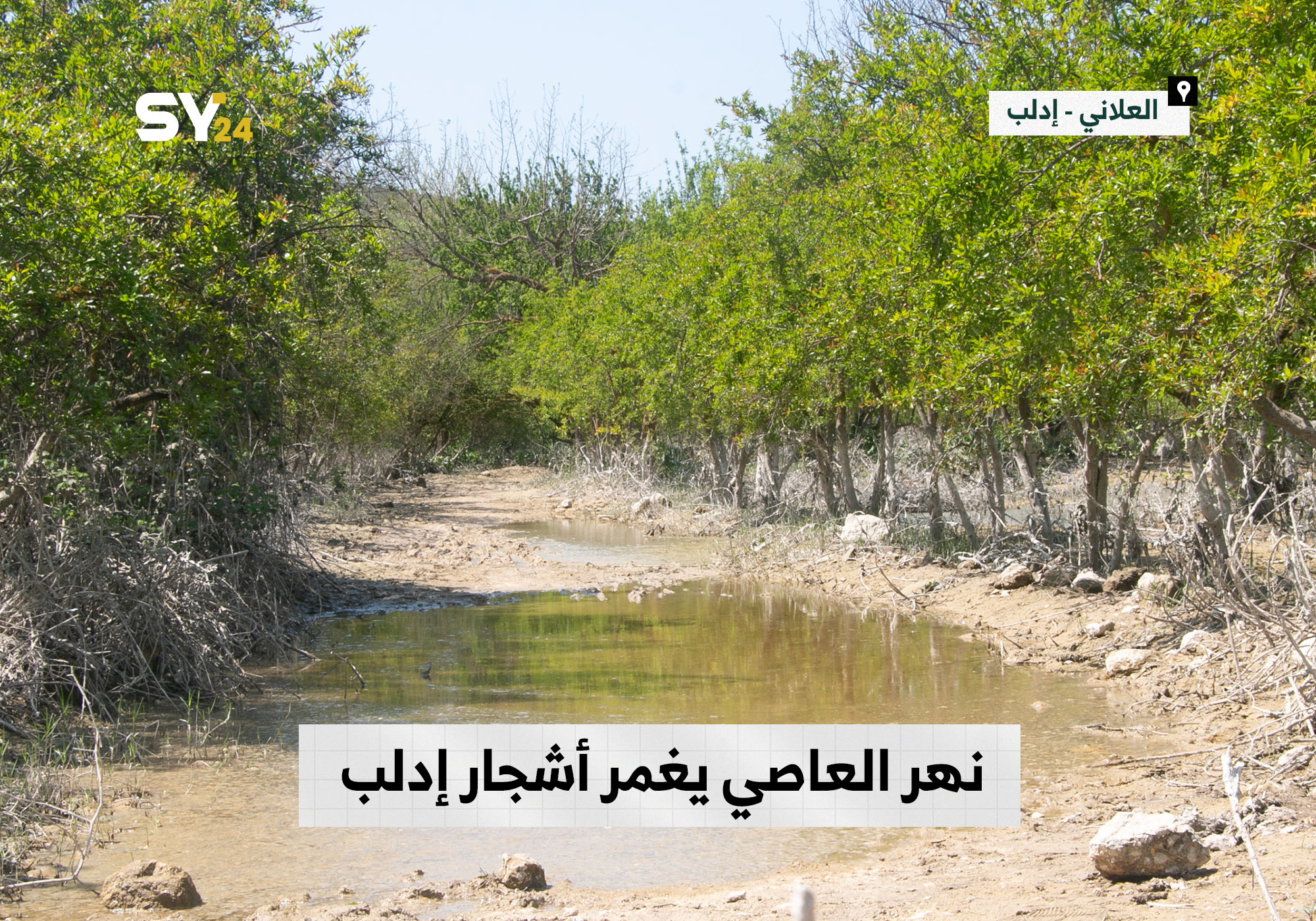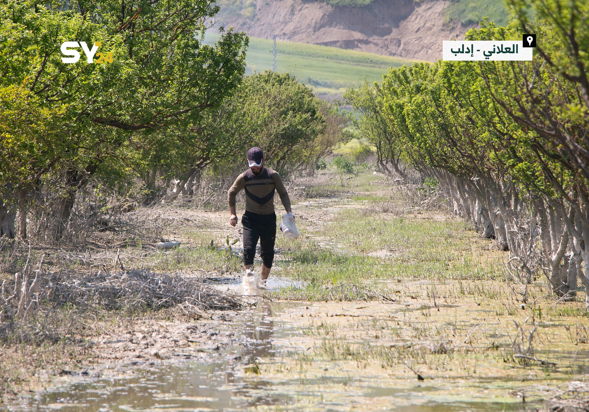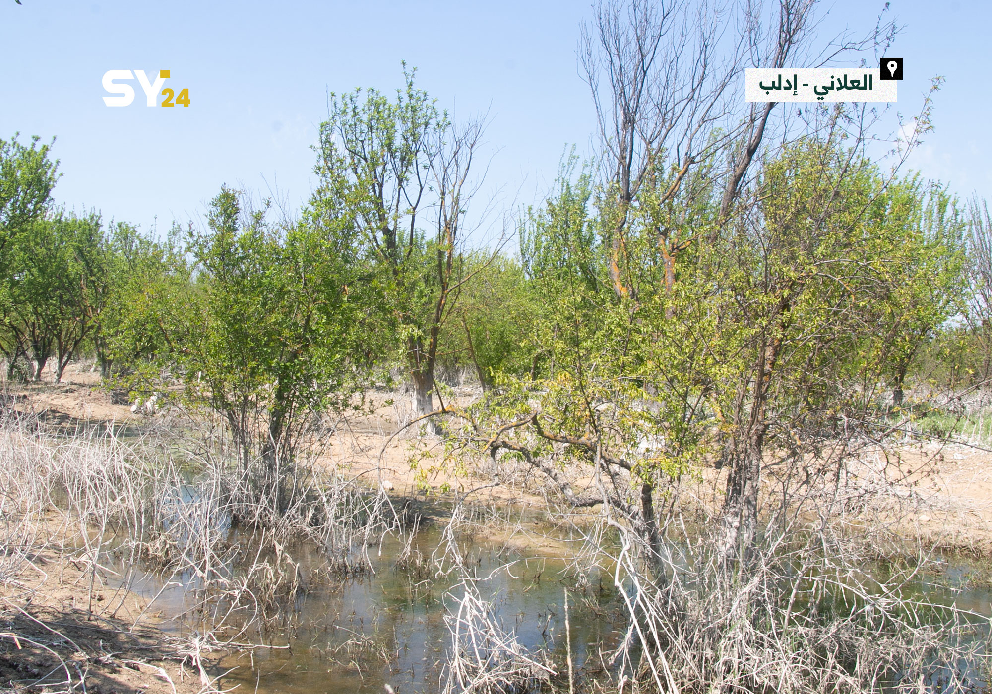 صور تظهر الأضرار التي لحقت بأشجار اللوزيات في قرية العلاني بريف إدلب، جراء ارتفاع منسوب المياه في نهر العاصي.