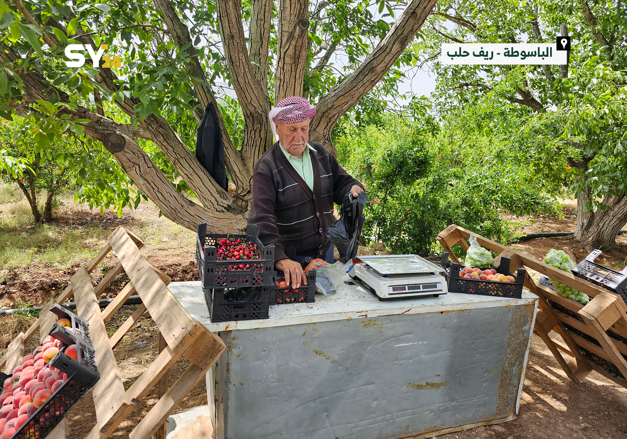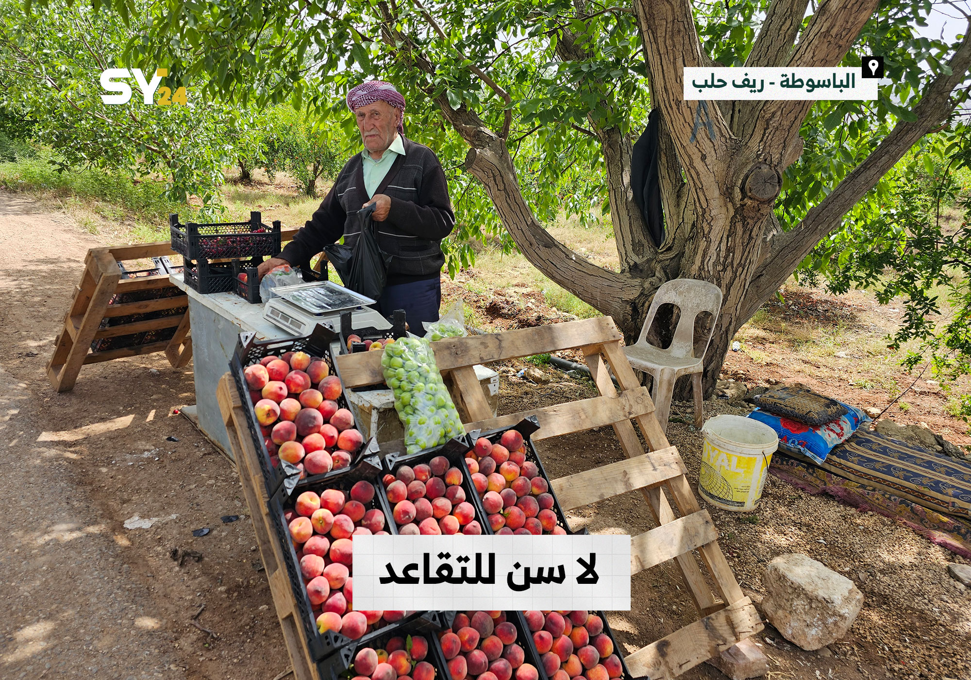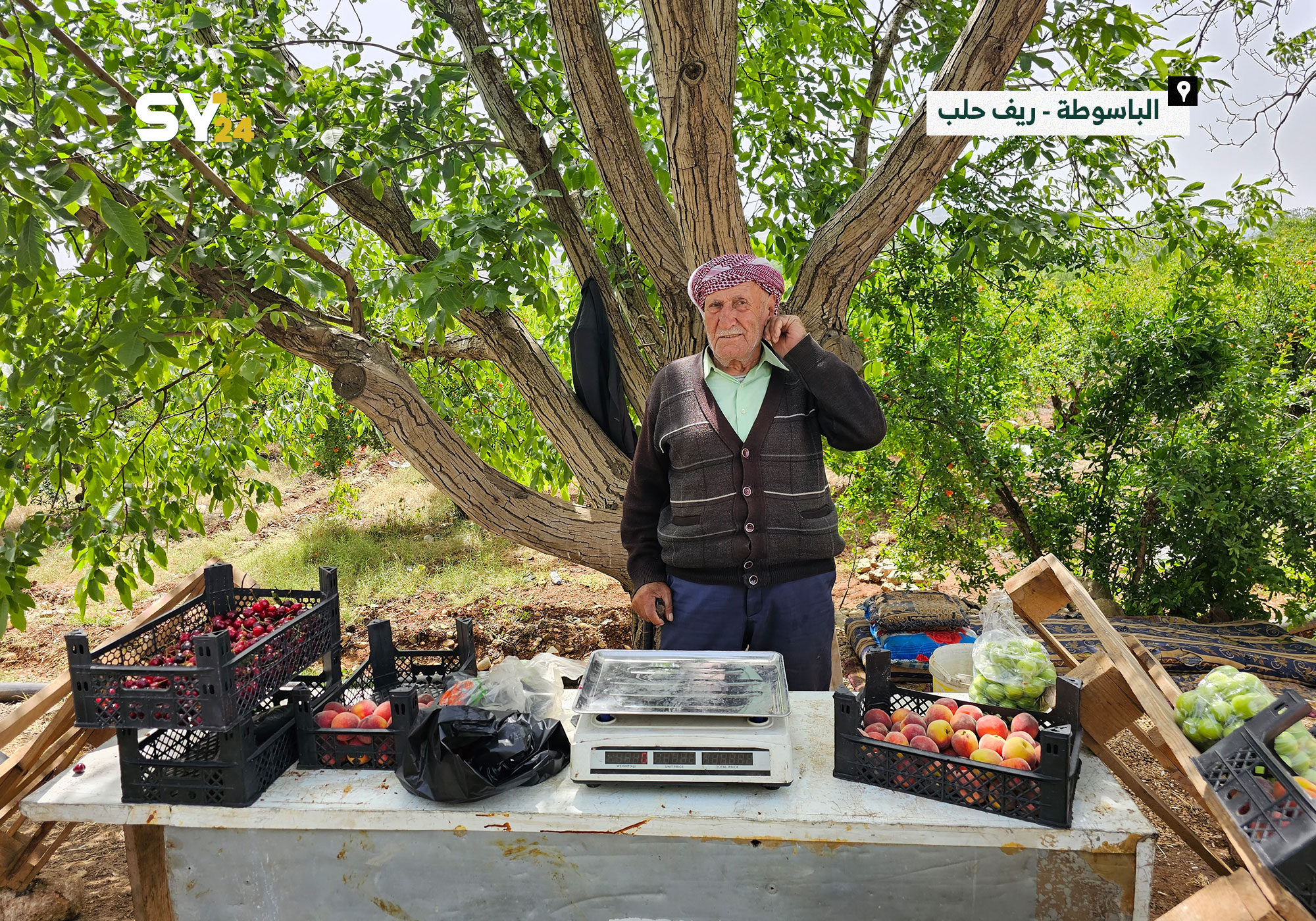 العم زكي حسن أبو محمد من قرية الباسوطة بريف عفرين يقارب الـ 90 عاماً، يقف على قارعة الطريق لبيع الفاكهة للمارة
