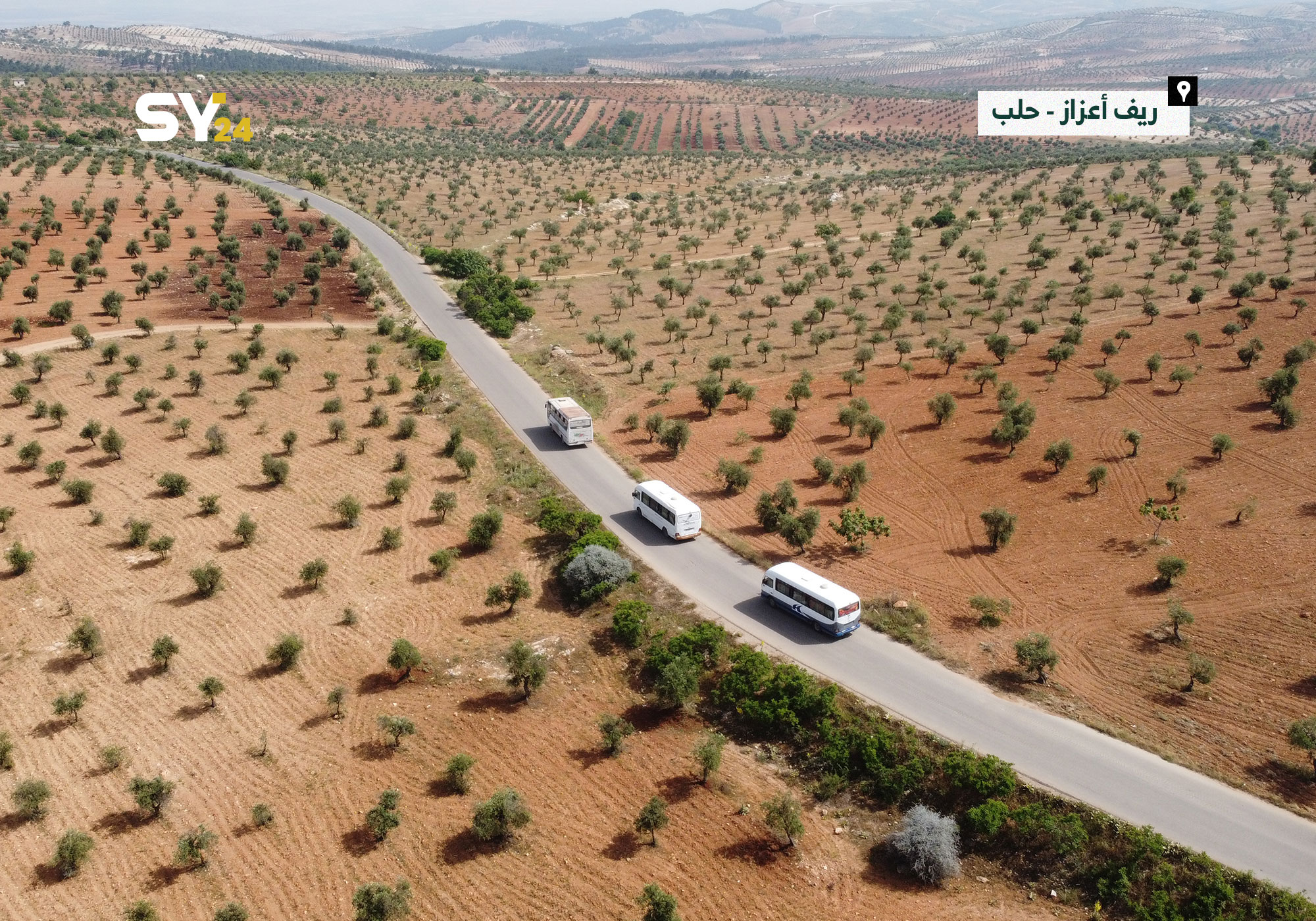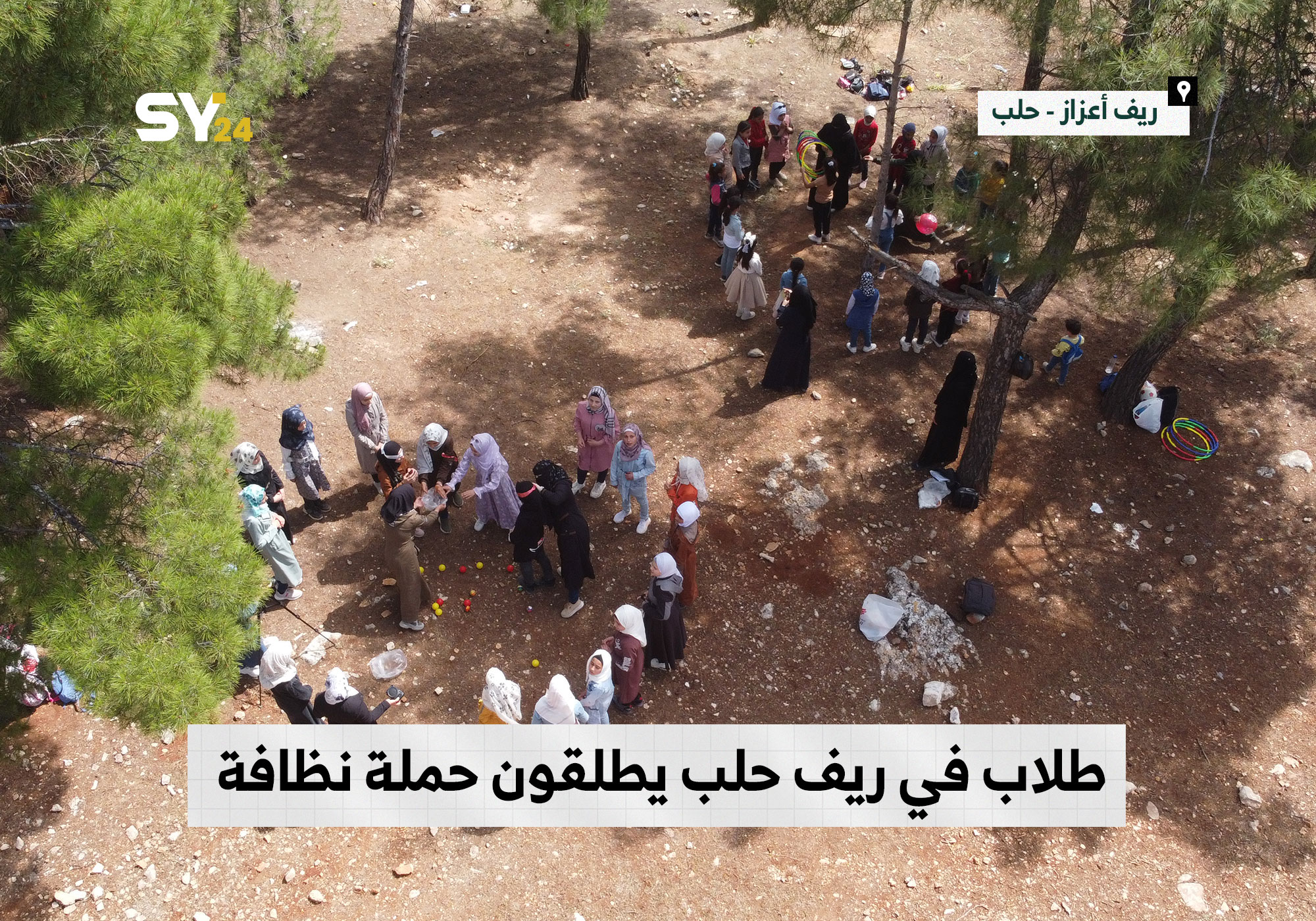 عشرات الطلاب في ريف مدينة أعزاز شمال حلب يشاركون في فعالية تهدف إلى جمع النفايات وفرزها، ووضع لافتات تحتوي على عبارات تؤكد على أهمية نظافة البيئة والمحافظة عليها.