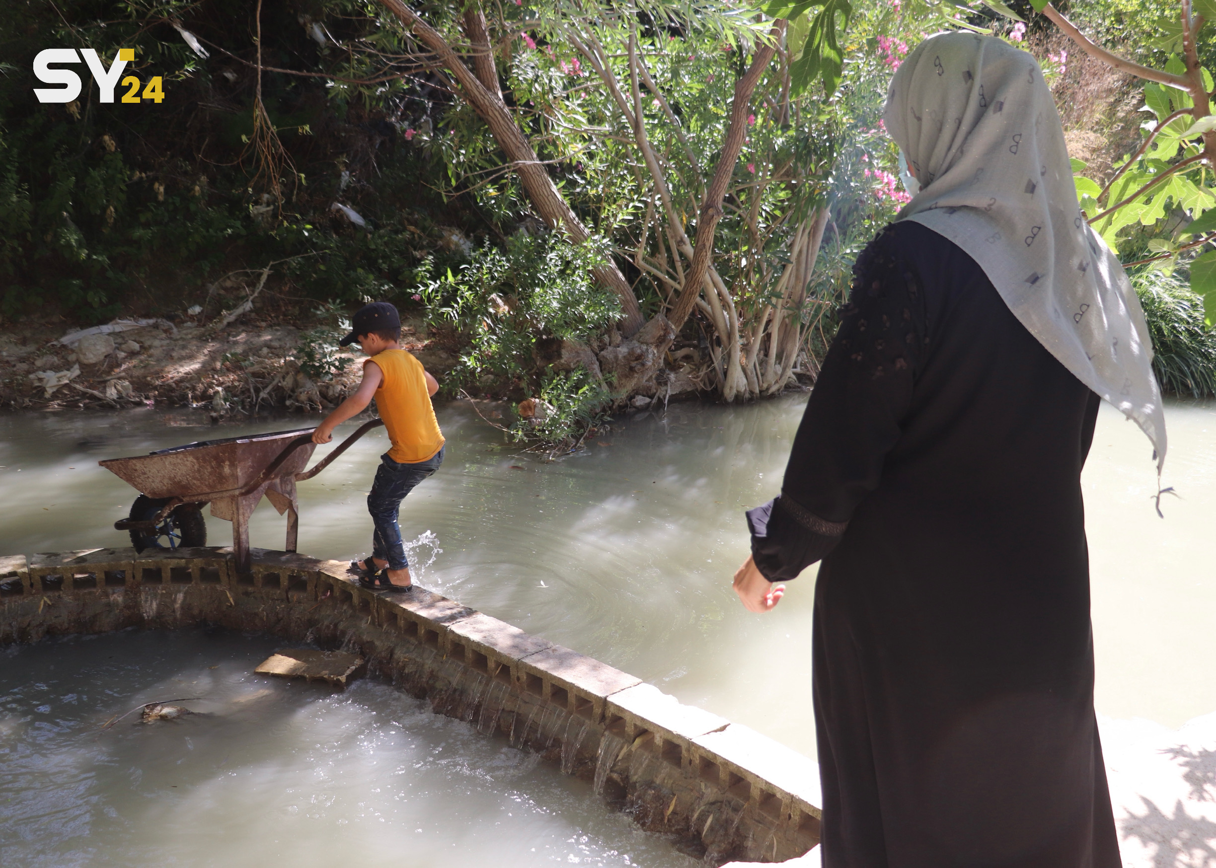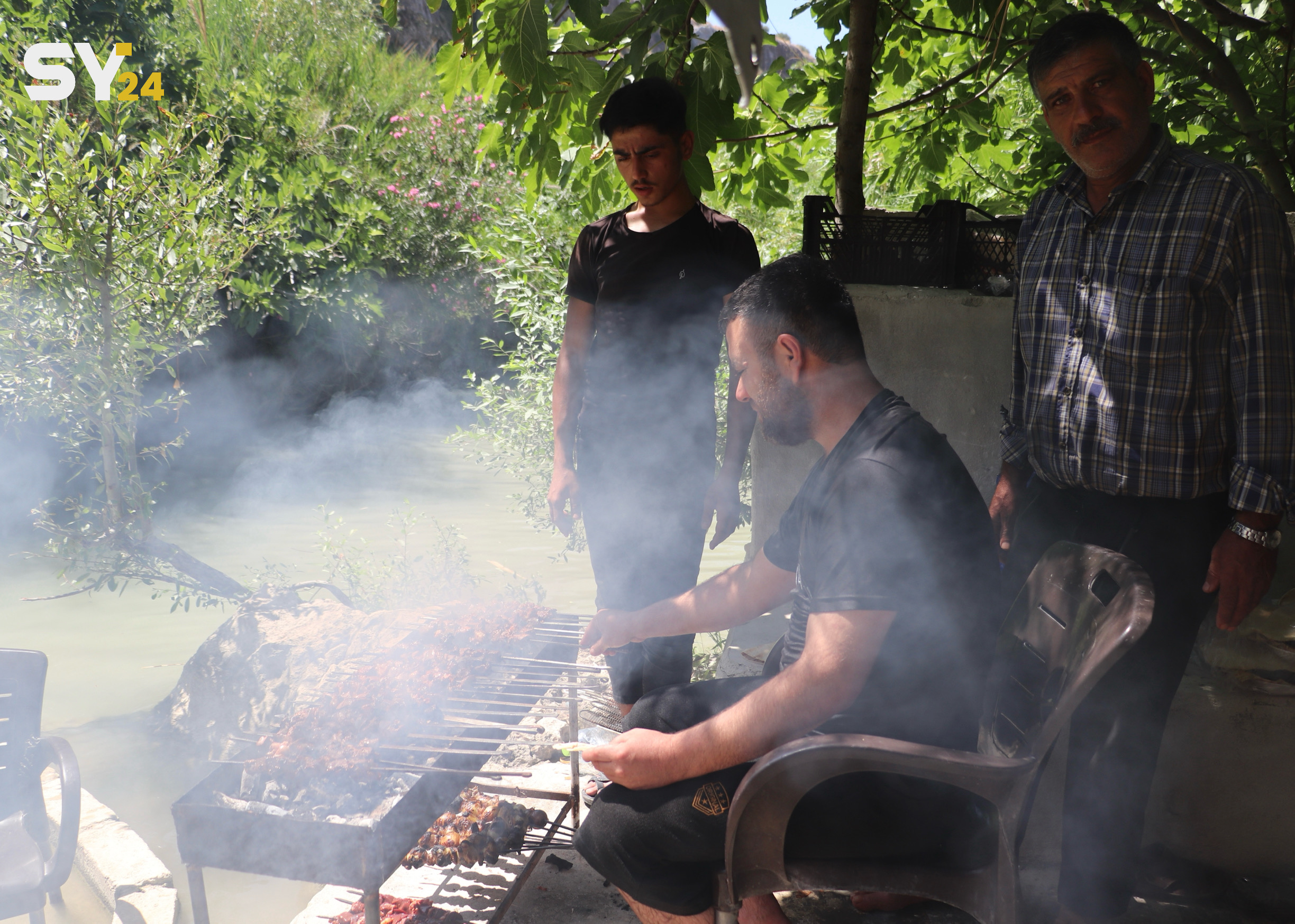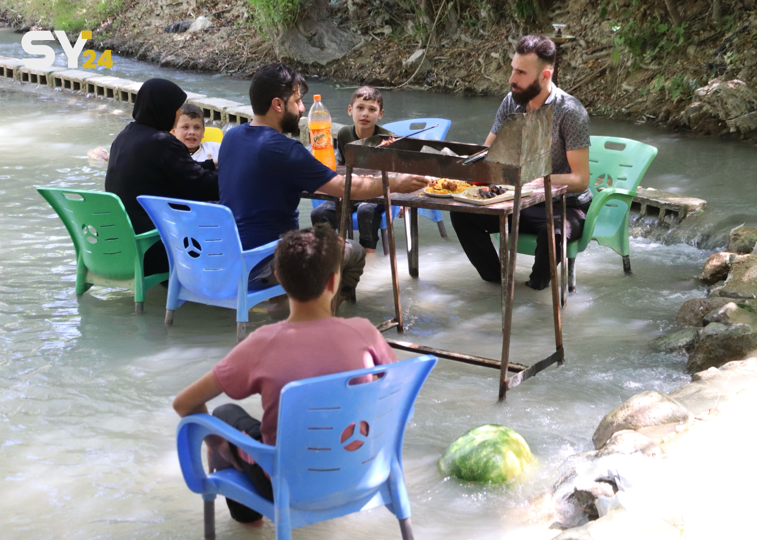بمساعدة أولادها، قامت أم محمد بإنشاء مساطب التنزه على أرضها المجاورة لنهر العاصي في ريف إدلب، وتُعد هذه المساطب ملاذًا للهاربين من حرارة الصيف وضجيج العمل.