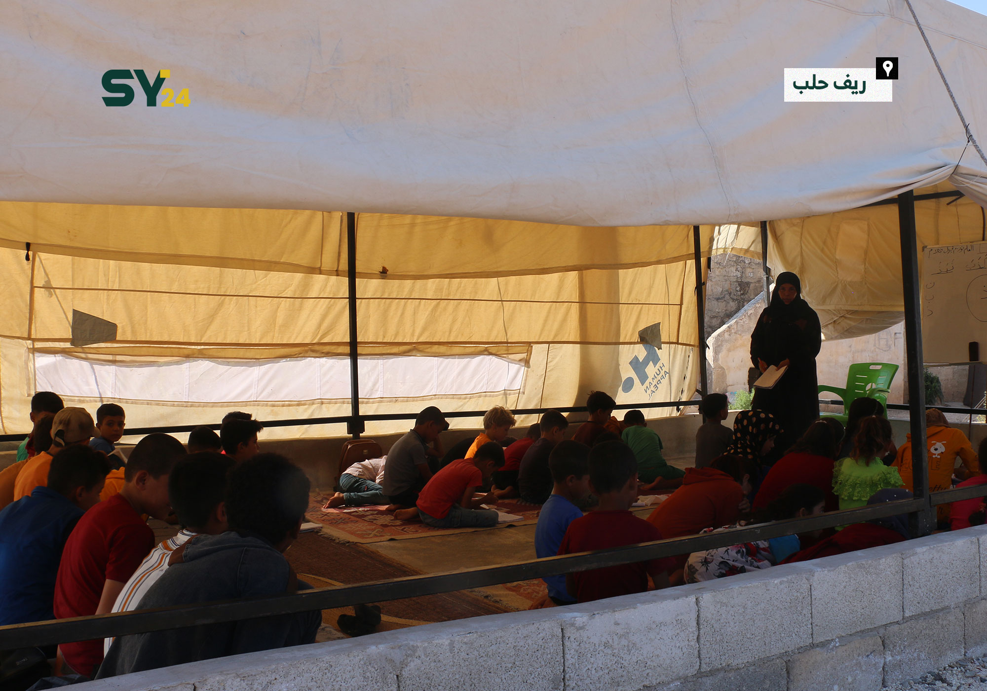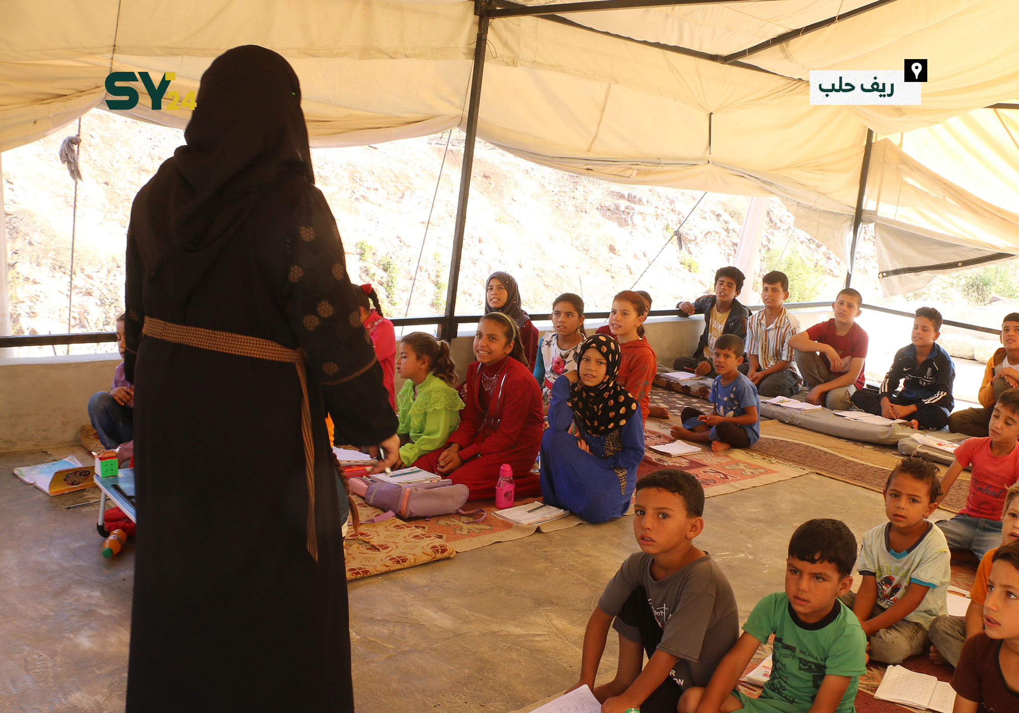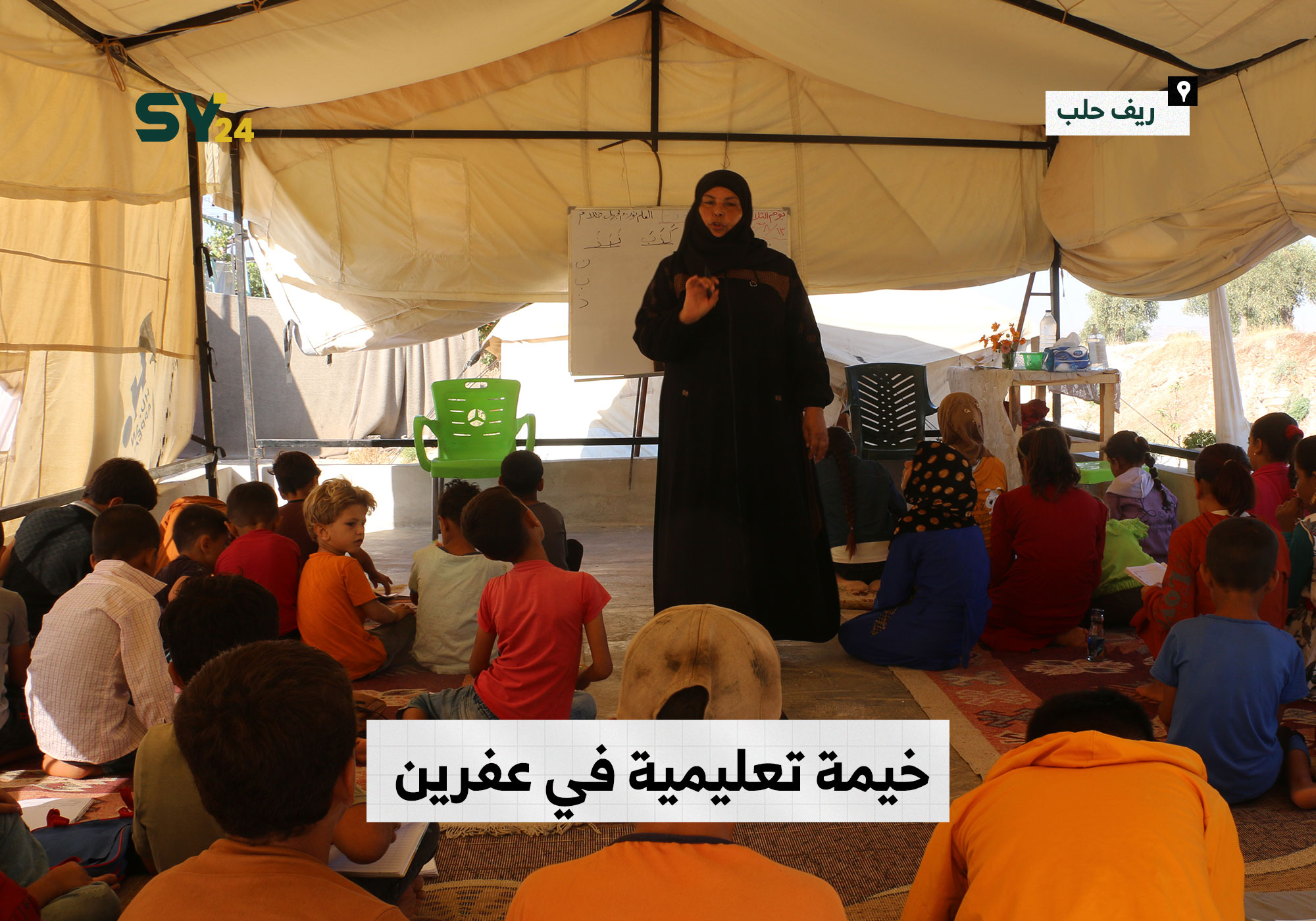 صور تظهر خيمة تعليمية في عفرين، ضمن مبادرة أطلقتها الآنسة خديجة لتعليم الأطفال القاطنين بعيداً عن المدارس.