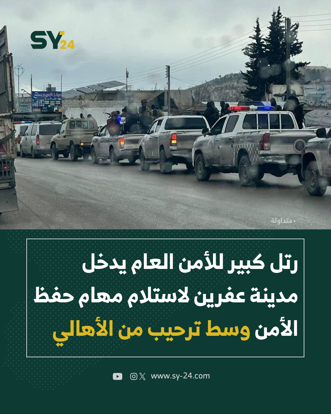 عفرين: رتل كبير للأمن العام يدخل المدينة، لاستلام مهام حفظ الأمن وسط ترحيب من الأهالي.