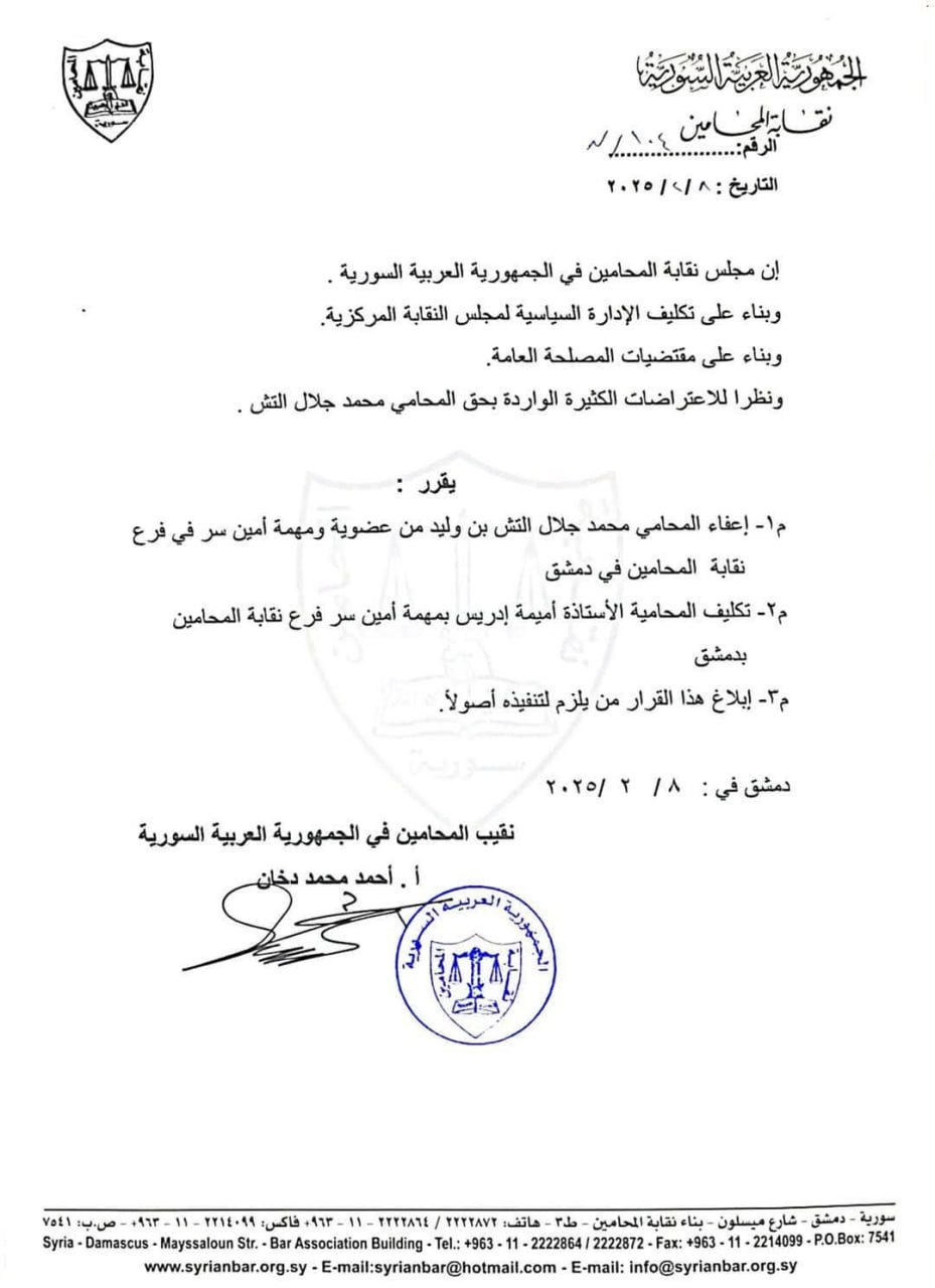 أثار تعيين المحامي جلال التش في فرع نقابة المحامين بدمشق ثم إعفاؤه لاحقًا جدلًا واسعًا، بعد موجة من الانتقادات على مواقع التواصل الاجتماعي، بسبب مواقفه المؤيدة لنظام الأسد البائد، الأمر الذي أثار تساؤلات حول آليات تعيين أعضاء الفروع في النقابة.
