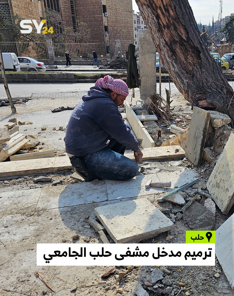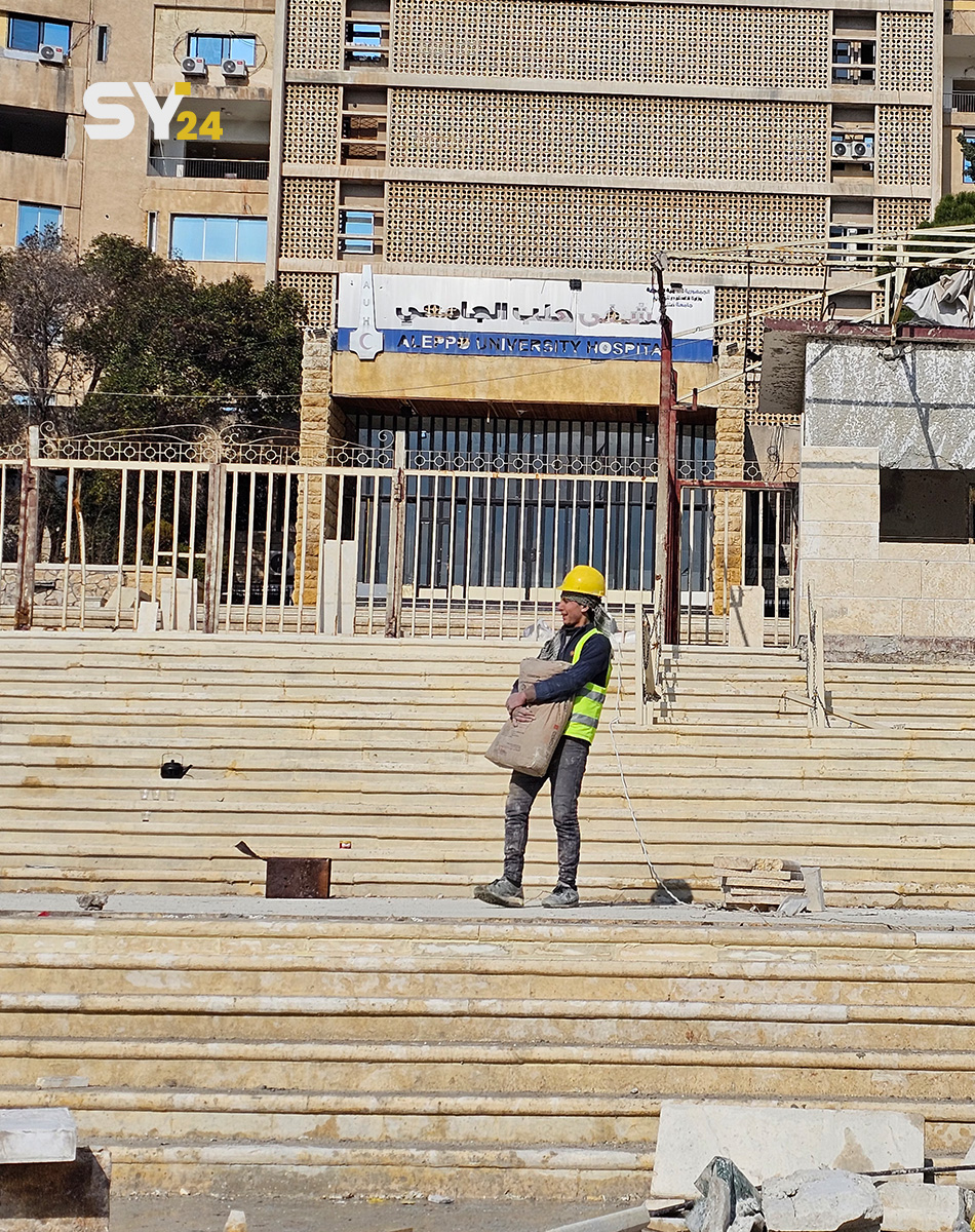 الدفاع المدني يعيد تأهيل مدخل مشفى حلب الجامعي المتضرر جراء قصف جوي سابق.