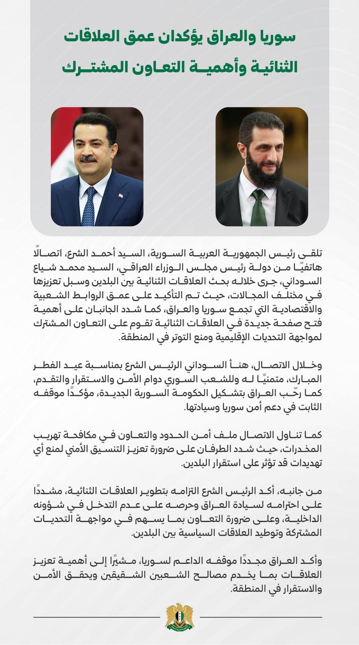 تلقى الرئيس السوري أحمد الشرع اتصالًا هاتفيًا من رئيس الوزراء العراقي محمد شياع السوداني، تم خلاله بحث العلاقات الثنائية بين البلدين وسبل تعزيزها في مختلف المجالات.