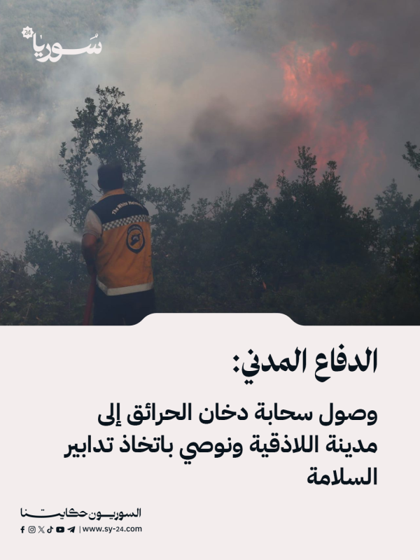 الدفاع المدني: وصول سحابة دخان الحرائق إلى مدينة اللاذقية ونوصي باتخاذ تدابير السلامة