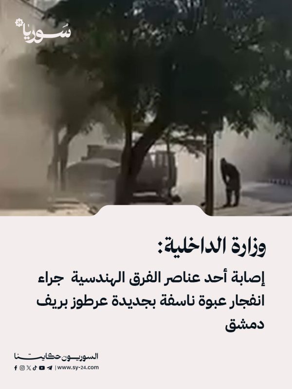 وزارة الداخلية: إصابة أحد عناصر الفرق الهندسية جراء انفجار عبوة ناسفة بجديدة عرطوز بريف دمشق