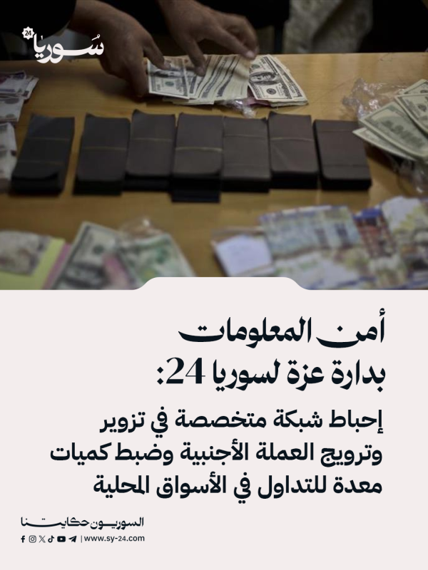 أمن المعلومات بدارة عزة لسوريا 24: إحباط شبكة متخصصة في تزوير وترويج العملة الأجنبية وضبط كميات معدة للتداول في الأسواق المحلية