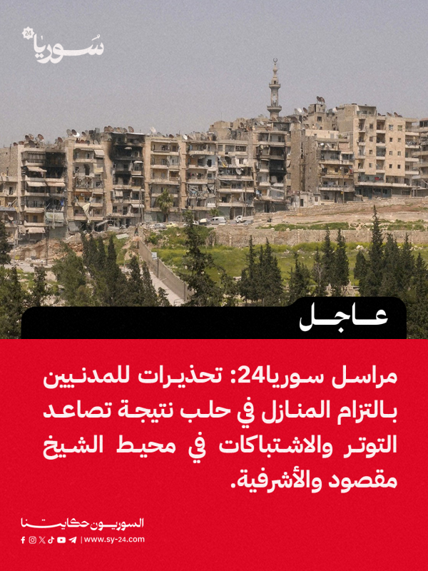 مراسل سوريا24: تحذيرات للمدنيين بالتزام المنازل في حلب نتيجة تصاعد التوتر والاشتباكات في محيط الشيخ مقصود والأشرفية