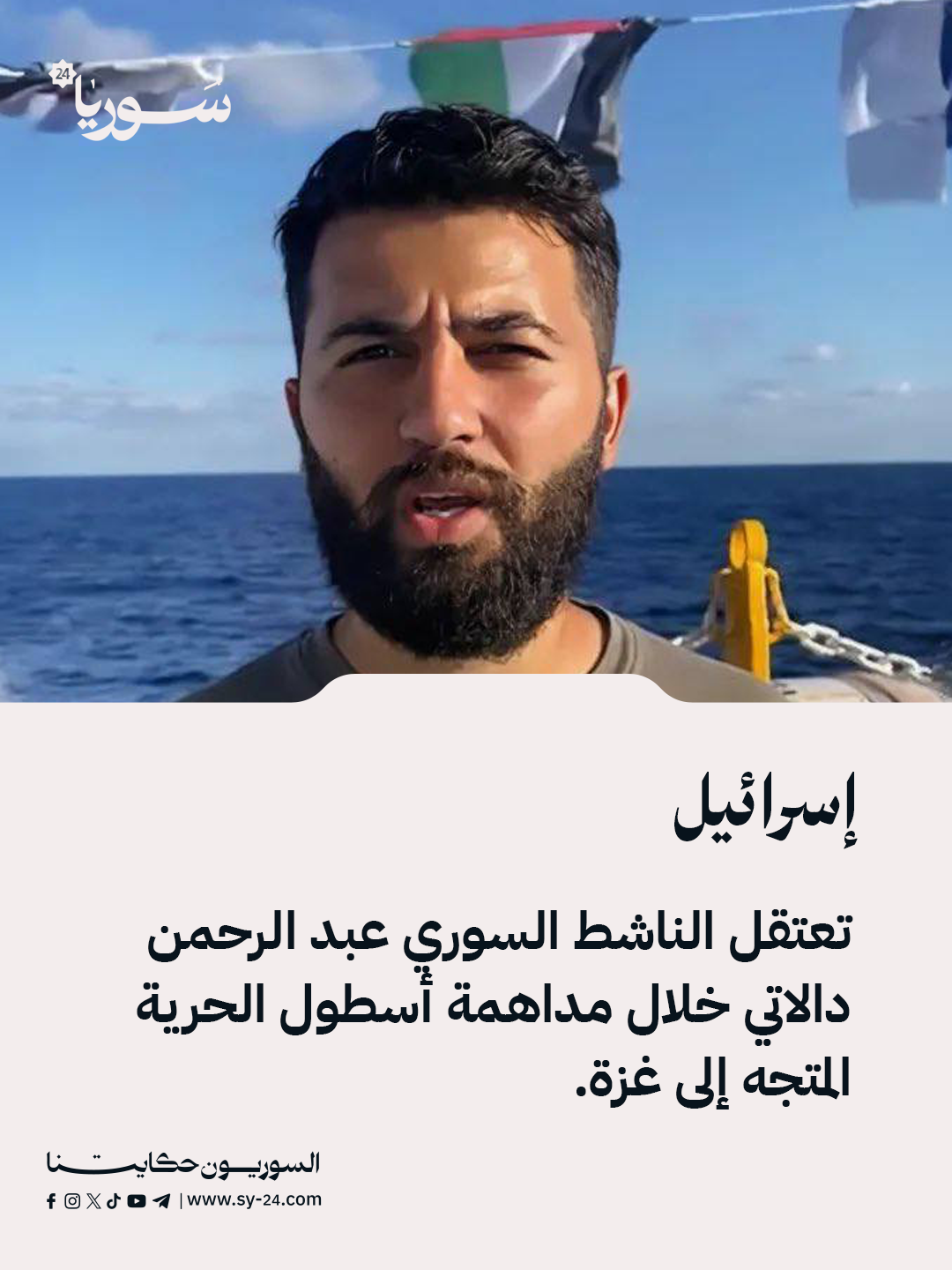 القوات الإسرائيلية تعتقل الناشط السوري عبد الرحمن دالاتي عقب مداهمتها إحدى سفن أسطول الحرية المتجهة إلى قطاع غزة.