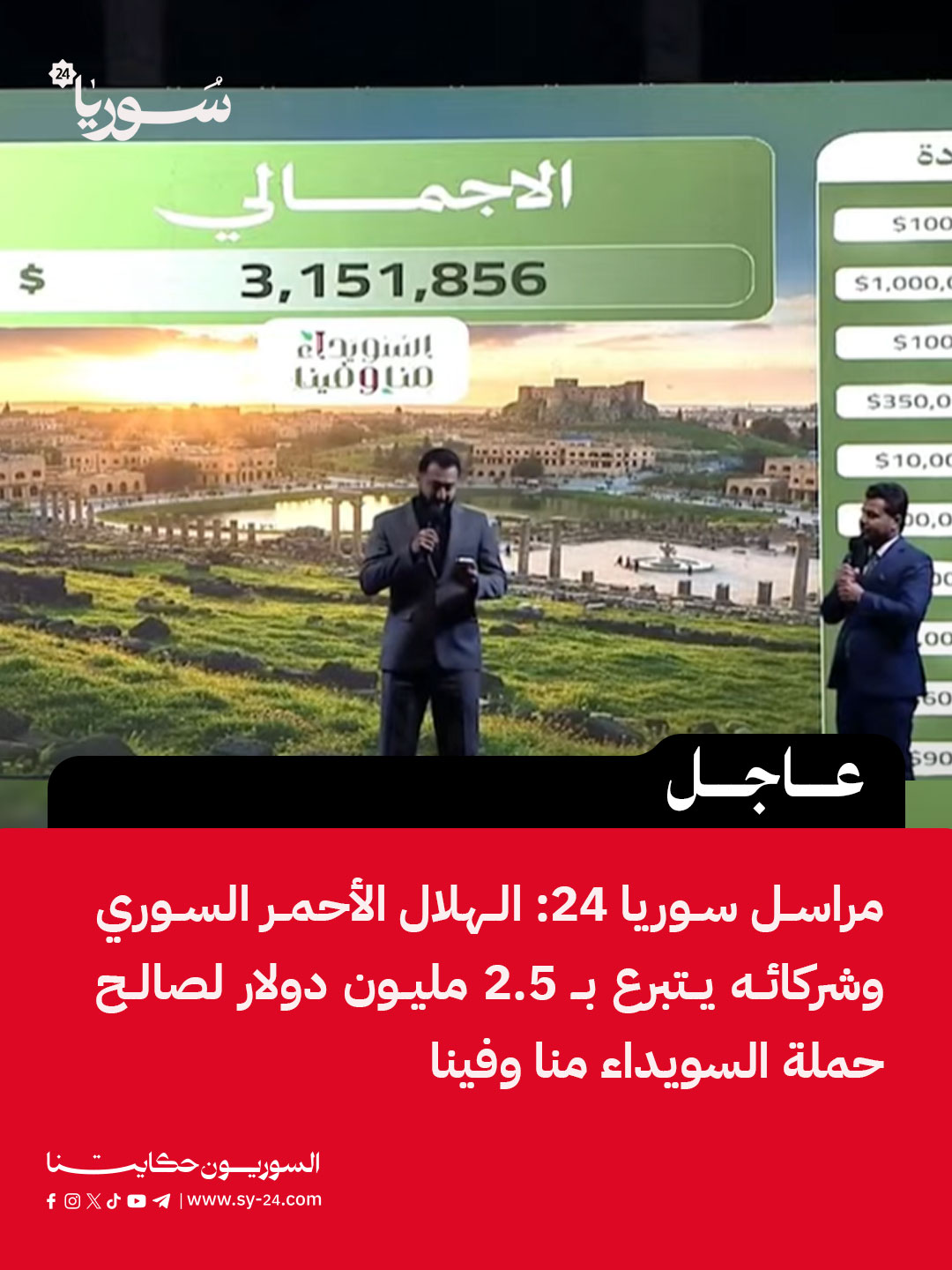 مراسل سوريا 24: الهلال الأحمر السوري وشركائه يتبرع بـ 2.5 مليون دولار لصالح حملة السويداء منا وفينا