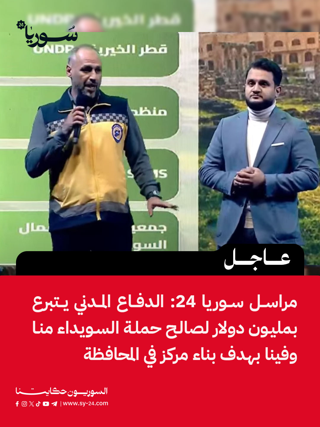 مراسل سوريا 24: الدفاع المدني يتبرع بمليون دولار لصالح حملة السويداء منا وفينا بهدف بناء مركز في المحافظة