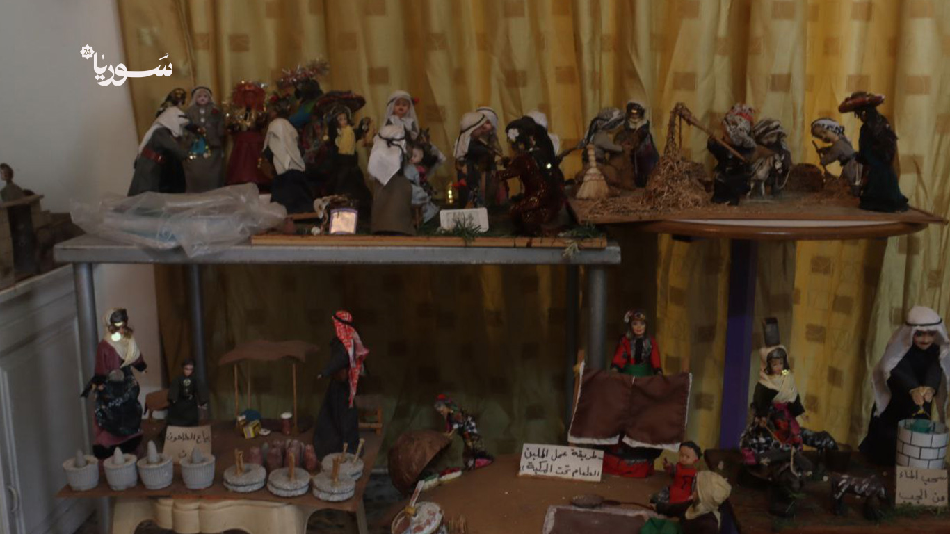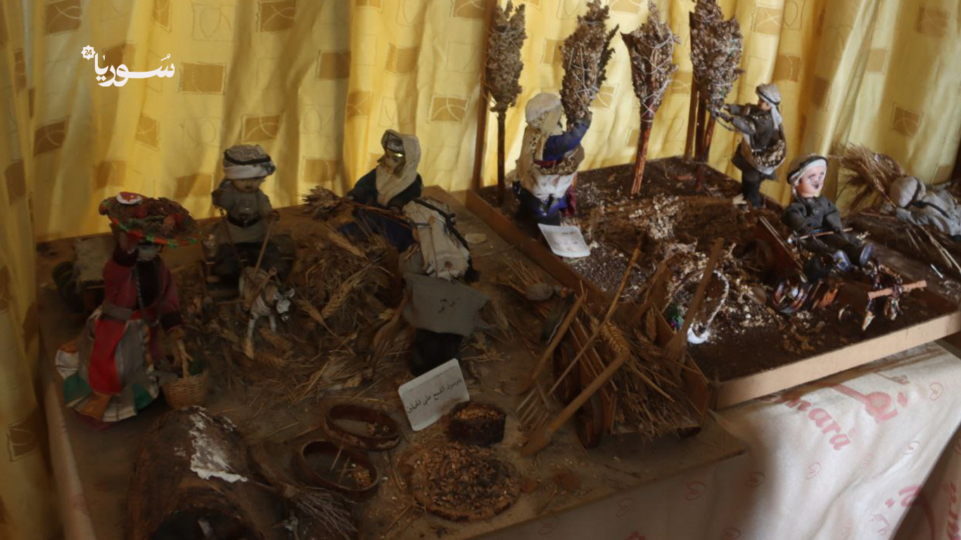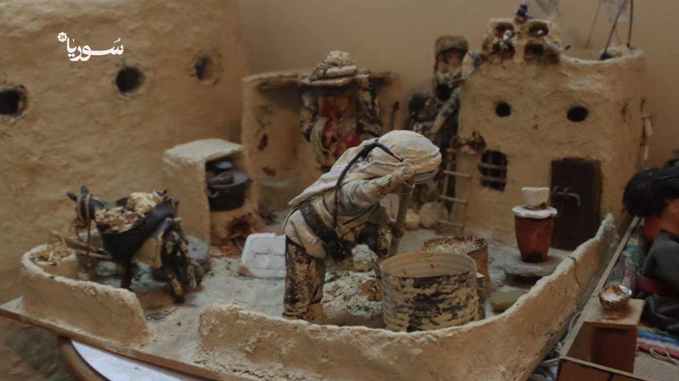كل قطعة في الغرفة تحمل قصة: مجسم لامرأة تخبز الخبز على التنور، آخر لرجل يحرث الأرض بمحراث خشبي، وثالث يصوّر سوقاً شعبياً بألوانه وأصواته.