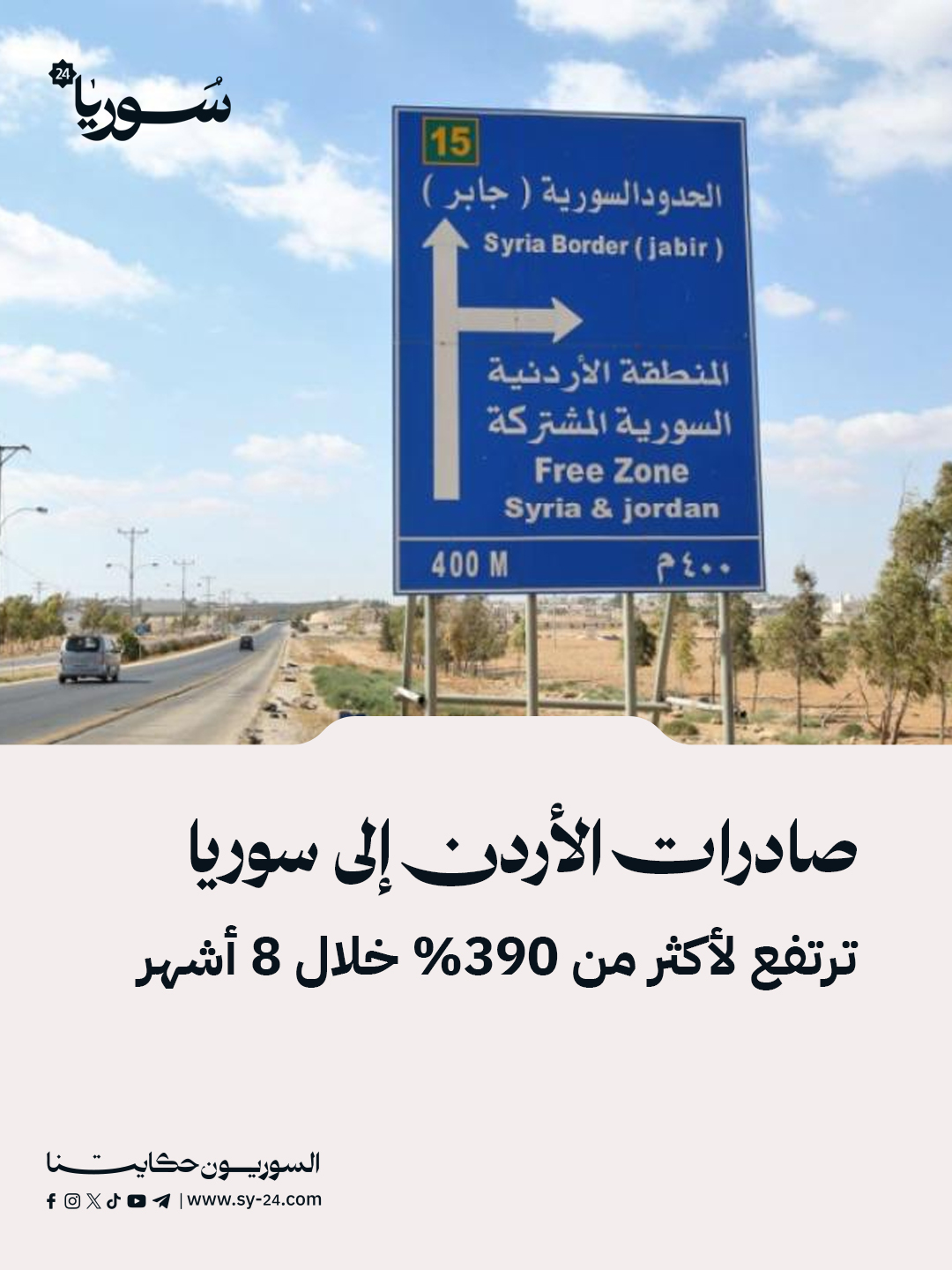 📌 ارتفعت الصادرات الأردنية إلى سوريا بنسبة 390.3% خلال الأشهر الثمانية الأولى من عام 2025.