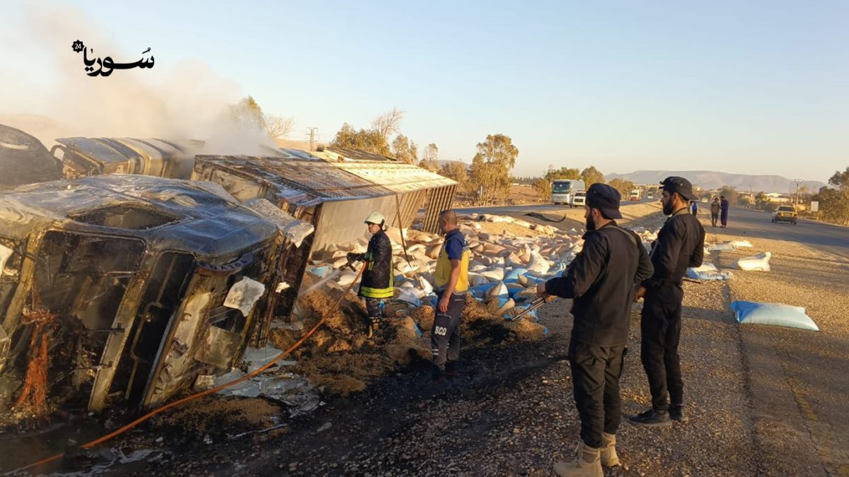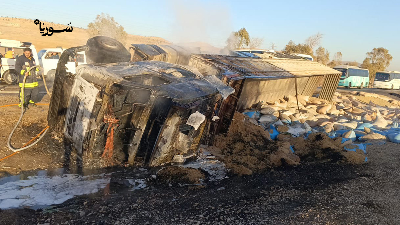 وذكرت مصادر خاصة لـ”سوريا 24″ أن إحدى الشاحنات كانت تسير بمحاذاة أخرى في المسرب ذاته، عندما حاول سائقها التجاوز نحو اليسار، فانزلقت إحدى العجلات على المنصف الوسطي، مما تسبب بفقدان السيطرة وانقلاب المركبة على جانب الطريق.