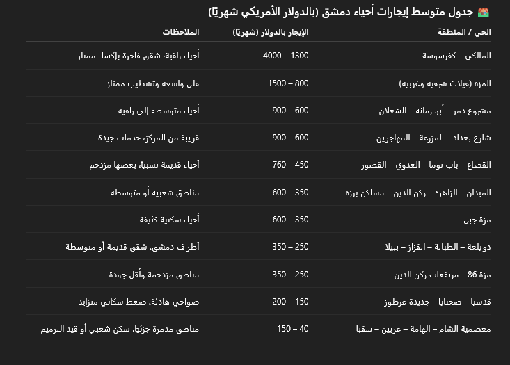 وفي مناطق مثل مشروع دمر، أبو رمانة، الشعلان، شارع بغداد، المزرعة، والمهاجرين، تتراوح الإيجارات بين 600 و900 دولار.