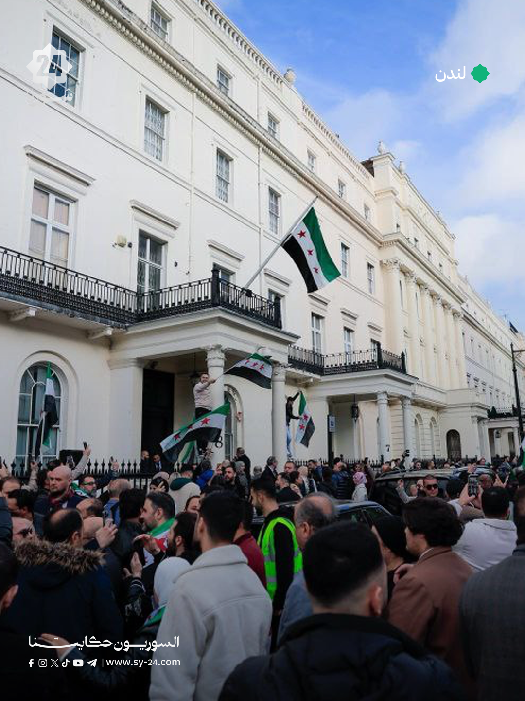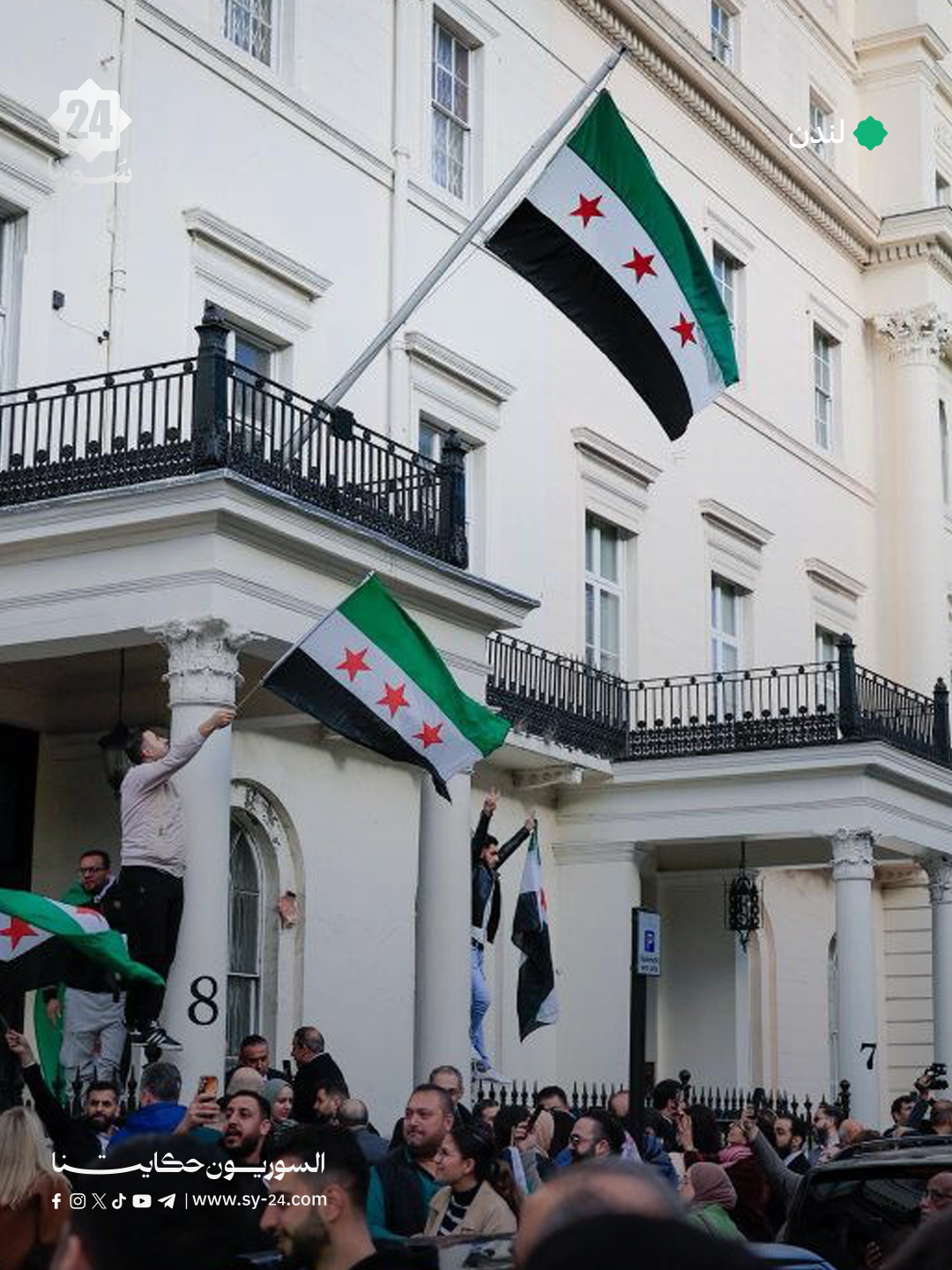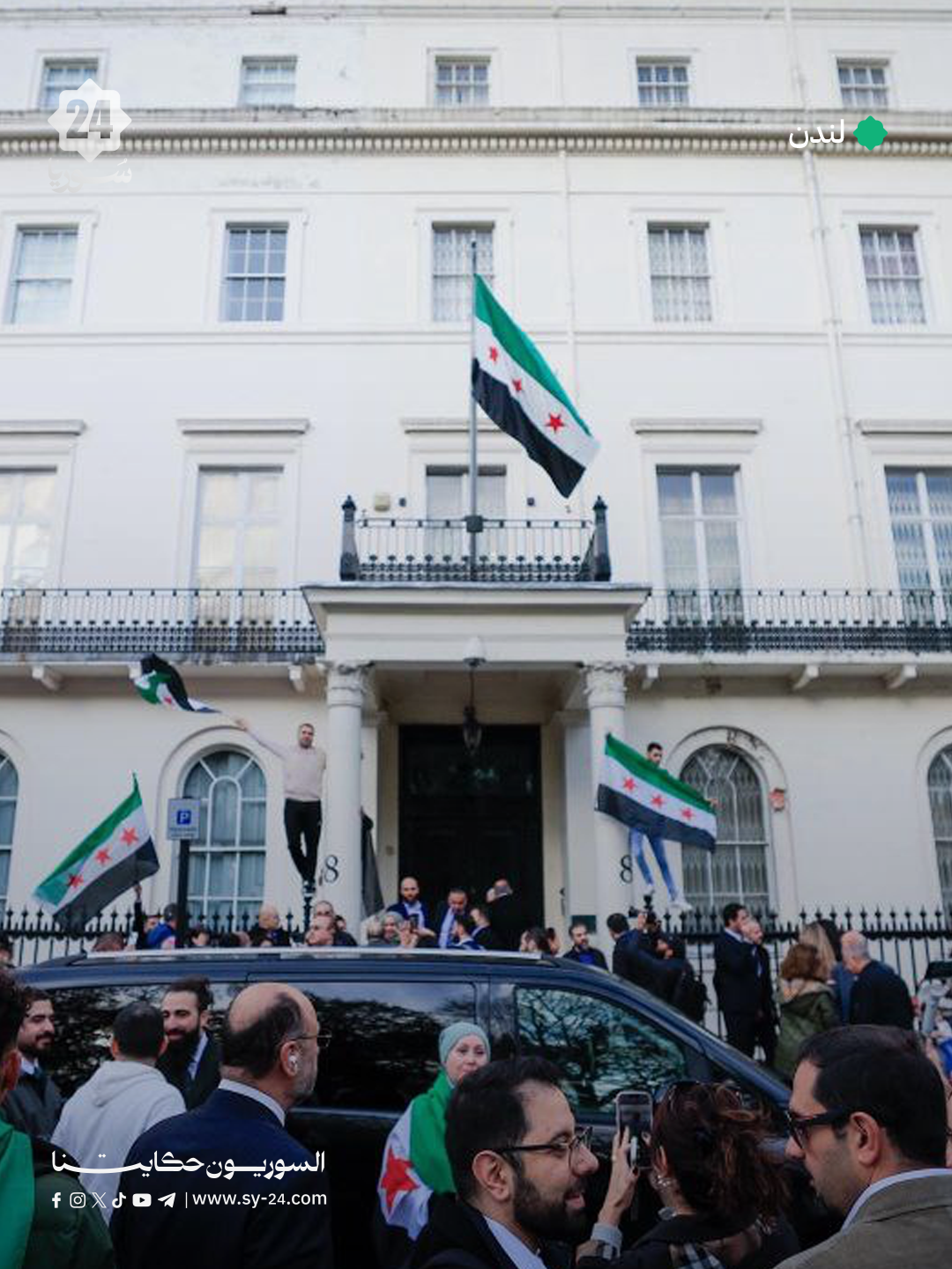 وزير الخارجية أسعد الشيباني يرفع علم سوريا فوق سفارتها في لندن بعد 14 عامًا من الإغلاق.