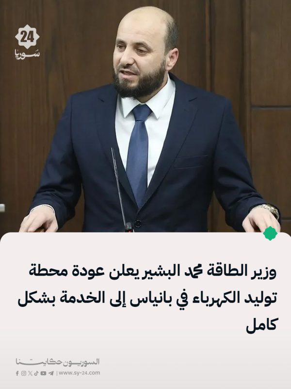 وزير الطاقة محمد البشير يعلن عودة محطة توليد الكهرباء في بانياس إلى الخدمة بشكل كامل