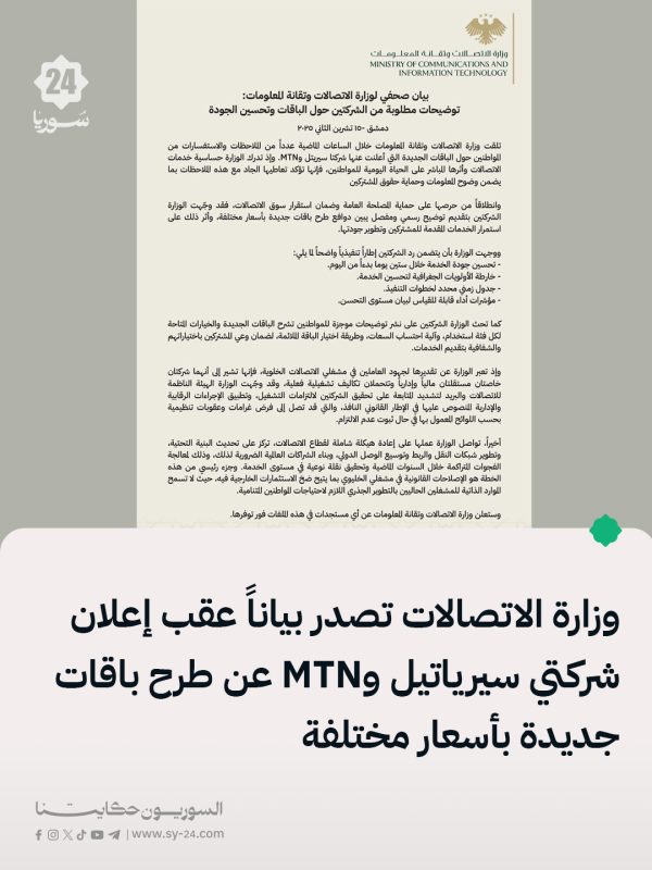 📌 طلبت الوزارة أن يتضمن رد الشركتين إطاراً تنفيذياً واضحاً لتحسين جودة الخدمة خلال ستين يوماً بدءاً من اليوم.