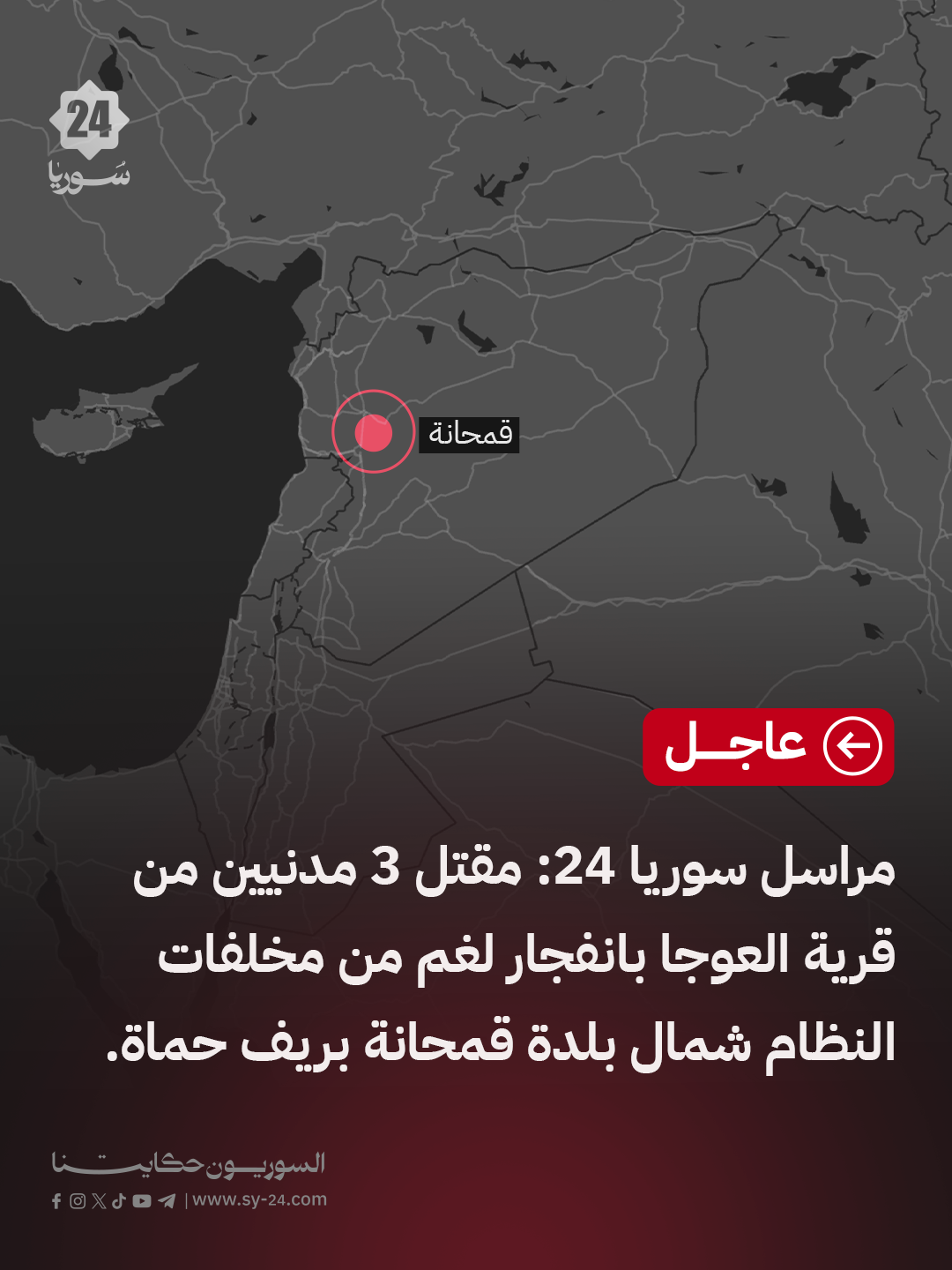 مراسل سوريا 24: مقتل 3 مدنيين من قرية العوجا بانفجار لغم من مخلفات النظام شمال بلدة قمحانة بريف حماة.