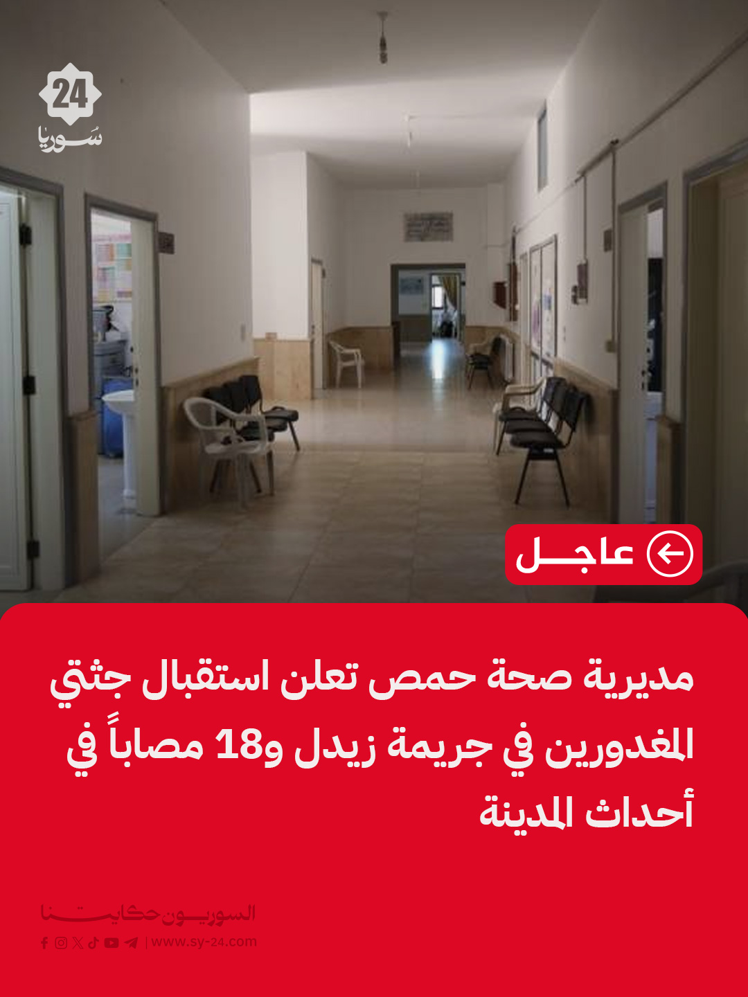 مديرية صحة حمص تعلن استقبال جثتي المغدورين في جريمة زيدل و18 مصاباً في أحداث المدينة