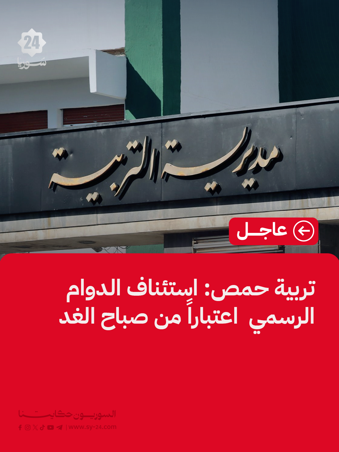 مديرية التربية في حمص تعلن استئناف الدوام في جميع المدارس ابتداءً من صباح الغد الثلاثاء