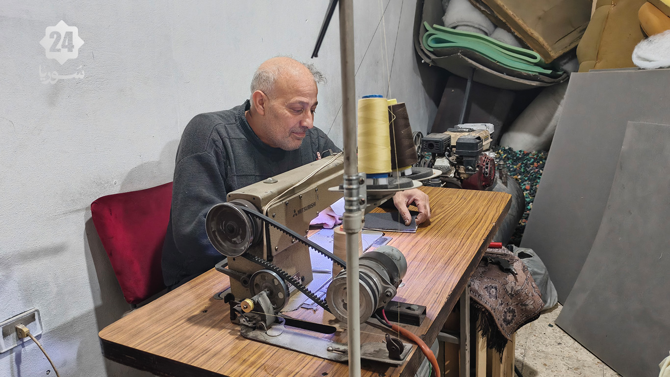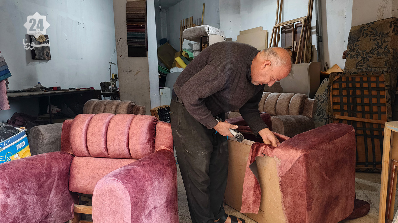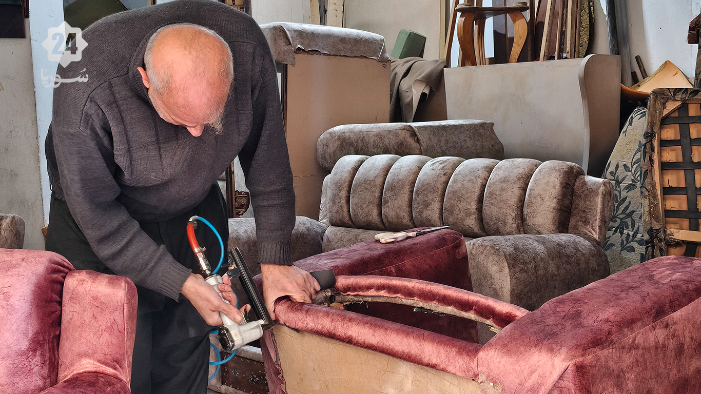 في زاوية ورشة متواضعة في مدينة التل بريف دمشق، تتردد أصوات ماكينة الخياطة القديمة التي يجلس خلفها محمد بدر الدين، المعروف بـ”أبي جمال”، منهمكًا في إعادة إحياء طقم قديم من المفروشات العربية. يثبت الرجل الخمسيني قطعة قماش جديدة اختارها بعناية، مضيفًا إليها لمسات عصرية تجعل من المجلس العربي القديم قطعة متجددة تنبض بالحياة، وكأنها لم تعش سنوات طويلة من الاستخدام.