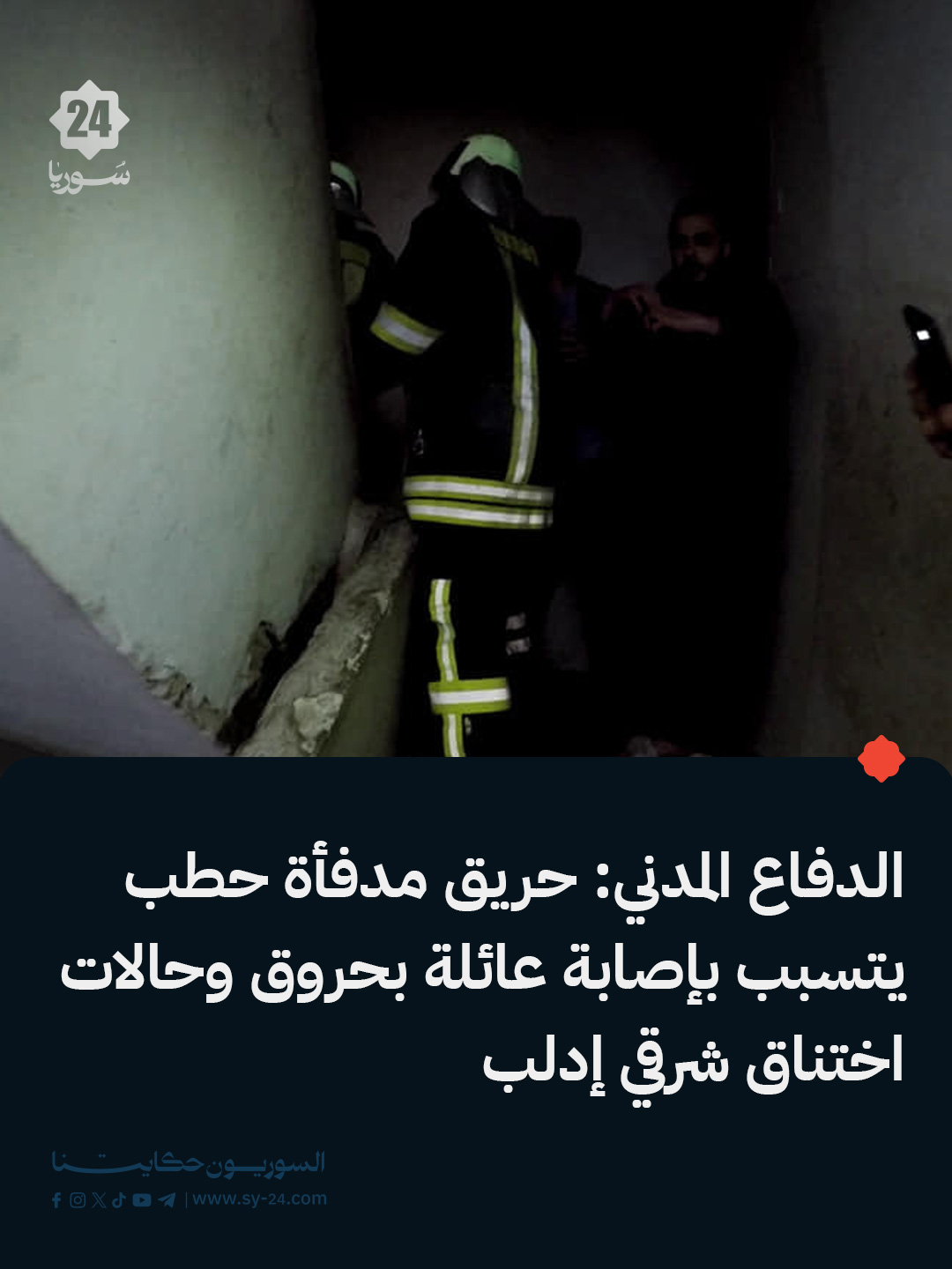 📌 إصابة عائلة مكونة من 4 أفراد بينهم أطفال بحروق وحالات اختناق نتيجة حريق بسبب مدفأة حطب في منزلهم.