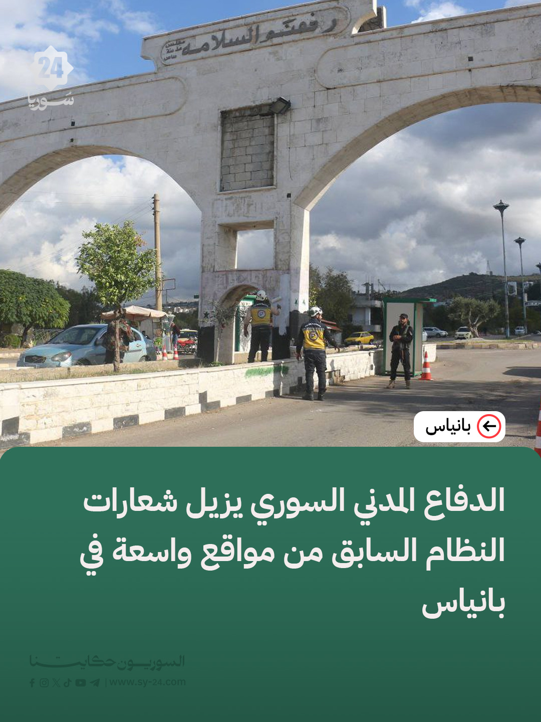 📌 فرق الدفاع المدني السوري تزيل الشعارات والأعلام التابعة للنظام السابق في مدينة بانياس.