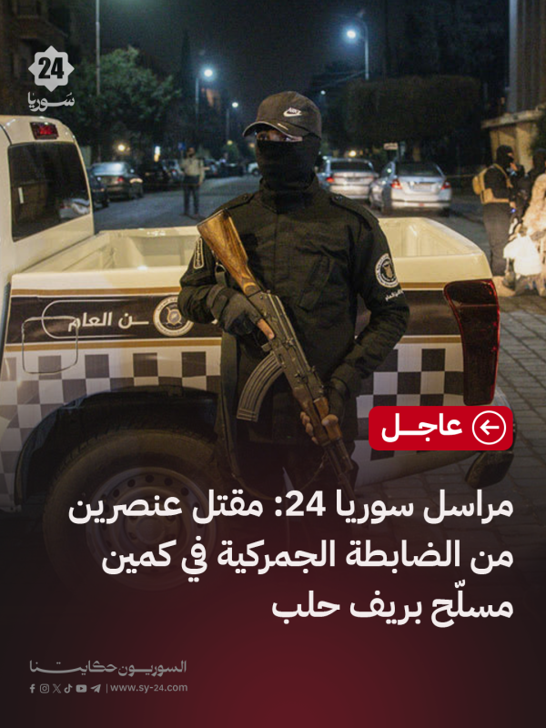 مقتل اثنين من عناصر الضابطة الجمركية نتيجة اعتداء مسلّح في الزربة بريف حلب.
