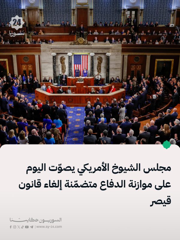 📌 مجلس الشيوخ الأمريكي يصوّت عند الساعة 07:30 مساءً بتوقيت دمشق على مشروع موازنة وزارة الدفاع الأمريكية بما يتضمن إلغاء قانون قيصر