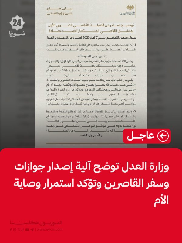 📌 صدر توضيح عن القاضي الشرعي الأول بدمشق، القاضي المستشار أحمد حمادة، حول التعميم رقم /17/ لعام 2025 الصادر عن وزير العدل.
