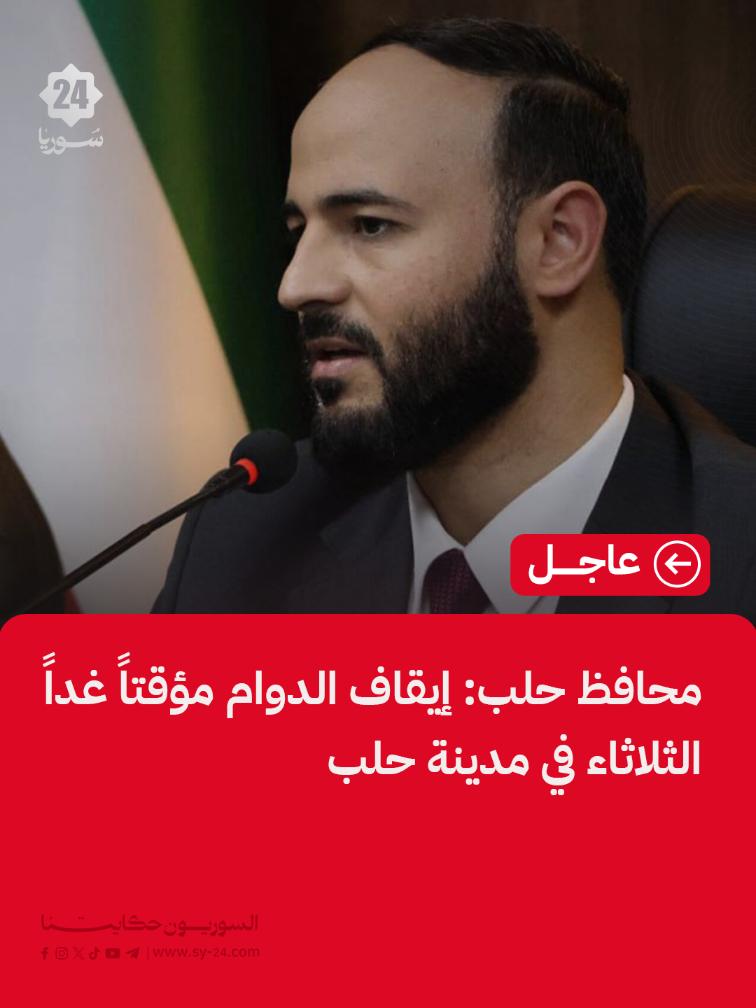 محافظ حلب: إيقاف الدوام مؤقتاً غداً الثلاثاء في مدينة حلب