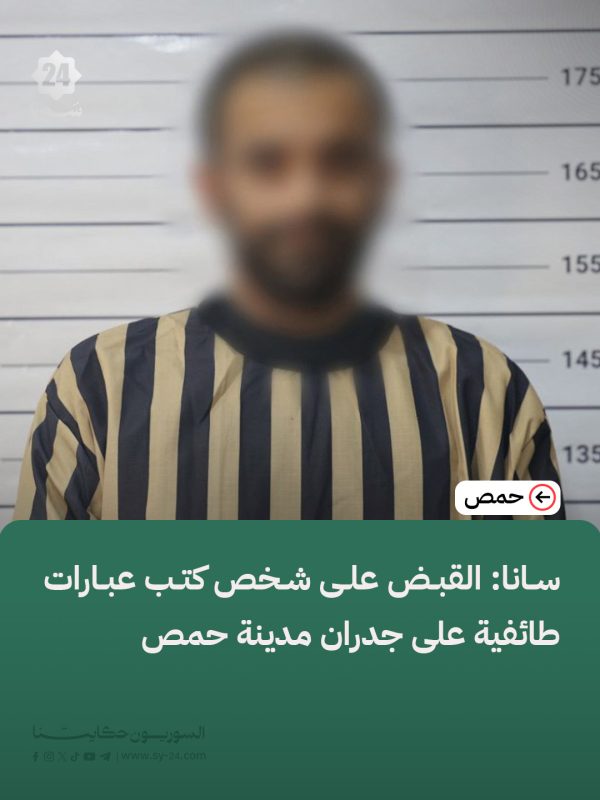 📌 قسم شرطة المحطة في حمص، بالتنسيق مع قسم المعلومات، ألقى القبض على شخص كتب عبارات طائفية تحريضية على جدران المدينة.