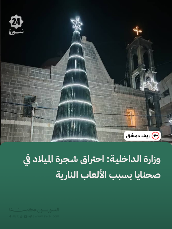 احتراق شجرة الميلاد في بلدة صحنايا بريف دمشق بسبب الألعاب النارية التي أُطلقت قربها