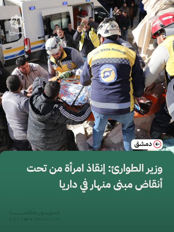 فرق الدفاع المدني السوري أنقذت امرأة عالقة تحت أنقاض مبنى مؤلف من ثلاثة طوابق في داريا.