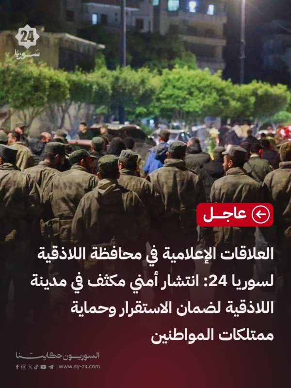 انتشار أمني مكثف لقوات الأمن الداخلي والجيش في أحياء مدينة اللاذقية لمتابعة الأوضاع الميدانية.